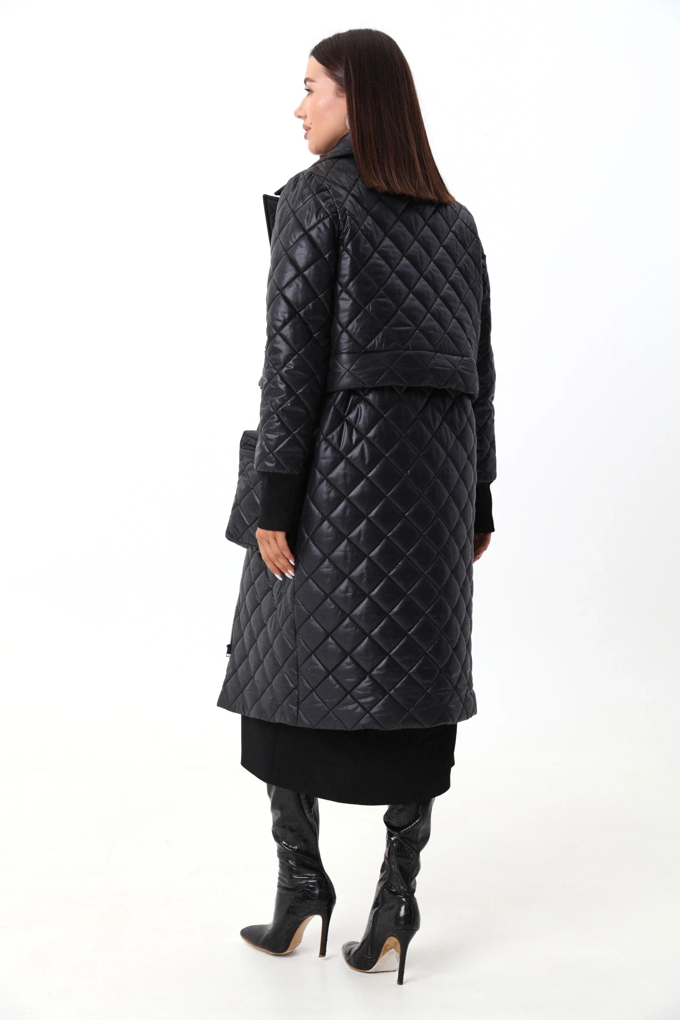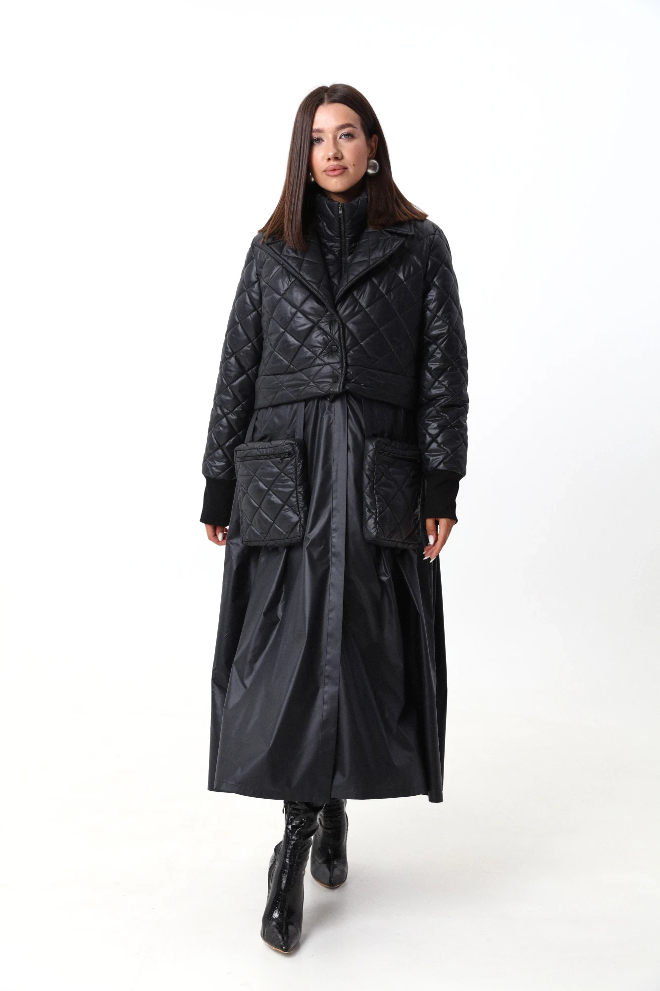 "Комплект , состоящий из жилета и куртки. Верхний слой комплекта составляет укороченная куртка с застёжкой на кнопки в сочетании с объёмной юбкой длины миди из тонкой плащёвой ткани. Юбка съёмная, пристёгивается к куртке на молнию, что позволяет носить куртку как отдельный элемент одежды. Куртка также дополнена съёмными карманами-сумочками с застёжкой на молнию. Нижний слой состоит из удлинённого жилета на молнии с карманами и воротником-стойкой. Жилет можно носить как отдельно, так и дополнив его круткой сверху. Сочетание всех трёх элементов позволяет создать тёплый многослойный образ.