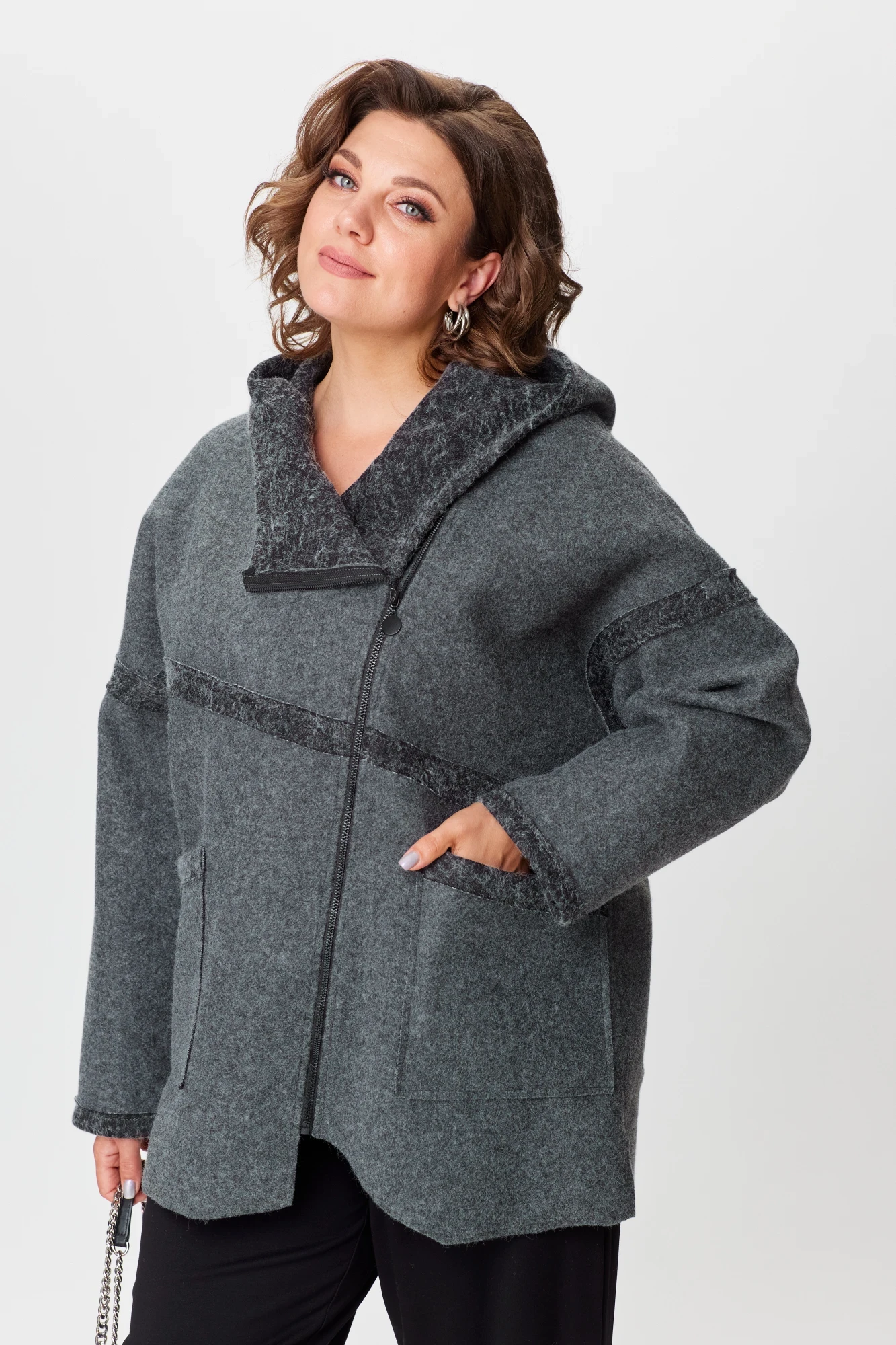 Женское полупальто для повседневной носки выполнено из шерстяной ткани. Полупальто свободного кроя с капюшоном. Плечо спущенное, рукав длинный втачной. Перед изделия с асимметричной косой застежкой на разъемную тесьму-молнию. Спинка прямая цельная. Полупальто украшено рельефными швами срезами наружу. По переду накладные карманы, на одном из которых в качестве декора используется декоративная печать. Низ изделия разноуровневый с необработанным краем. Полупальто смело сочетается с любым низом (юбка, брюки, джинсы) и обувью.