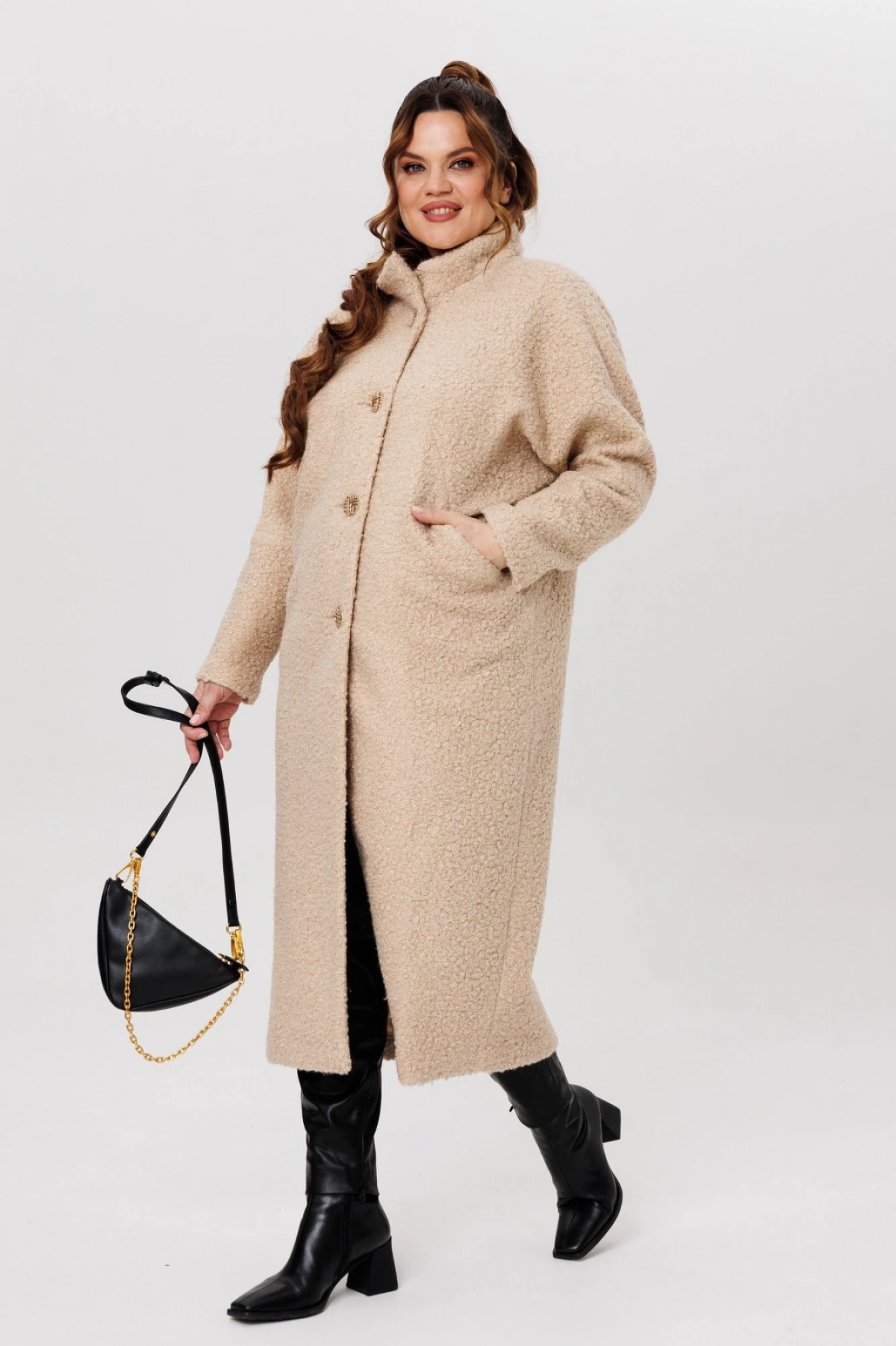 Длинное пальто из трикотажа мастхэв в осенне-весенний сезон. Пальто женское демисезонное в стиле бохо с ненавязчивым блеском. Свободный крой не сковывает движений, слегка зауженный низ подчеркивает формы, скрывая недостатки. Рукав длинный, цельнокроеный с отрезной нижней частью. Фигурные вытачки, идущие из бокового шва до центра груди, в вытачках имеются функциональные карманы. Горловина с воротником-стойкой, по переду центральная бортовая застежка на пуговицы. Спинка с центральным швом, по низу шлица. Пальто без подкладки. Изделие отлично сочетается с классическим денимом или темными брюками, или юбками любой длины. Также попробуйте накинуть такое пальто поверх любимого черного платья или просто носите со свитером.