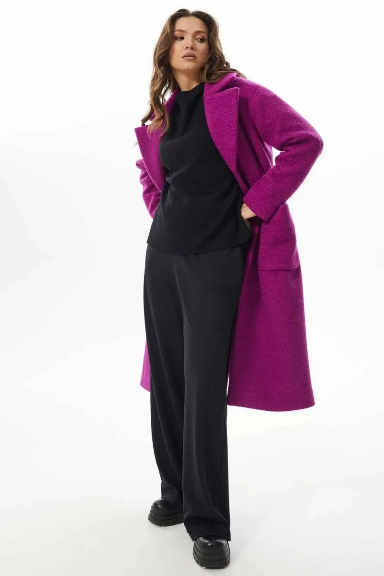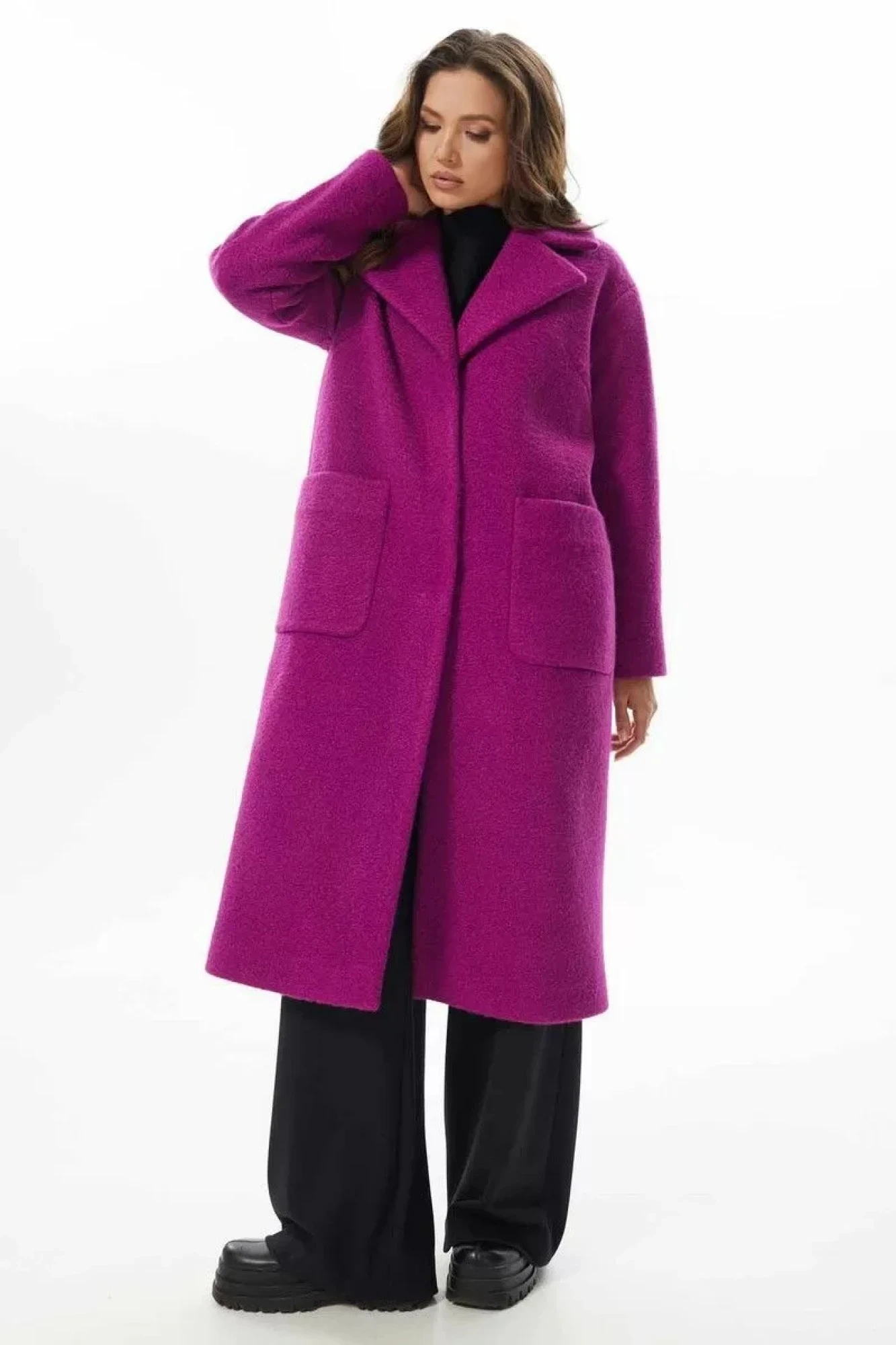 Пальто женское из пальтовой фактурной ткани с легким ворсом, прямого силуэта, на подкладке. С отложным воротником. Рукав двух шовный со спущенным плечом. Застежка центральная однобортная на пришивных кнопках, карманы накладные. По спинке средний шов заканчивается шлицей.