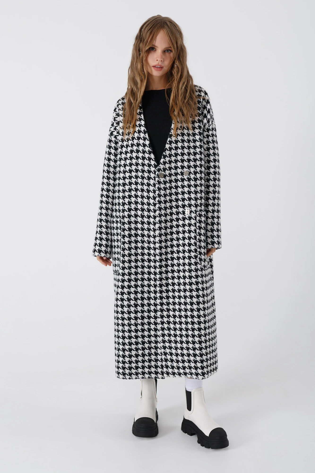 Двубортное свободное пальто без воротника с рисунком «гусиная лапка». Детали: прямой силуэт, спущенная линия плеча, перед с прорезными карманами, застежка на пришивные кнопки, спинка со средним швом и шлицей, рукава длинные, подкладка, съемный пояс