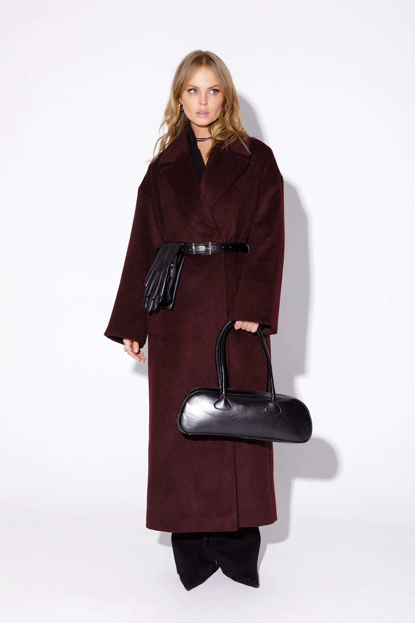 Свободное пальто-халат длины макси. Детали: прямой силуэт, спущенная линия плеча, перед с прорезными карманами, пиджачный воротник, двубортная застежка на пришивные кнопки, рукава длинные, съемный пояс со шлевками, пальто на подкладке Длина по спинке около 127 см; длина рукава+ плечо около 51,5+10,5=62 см