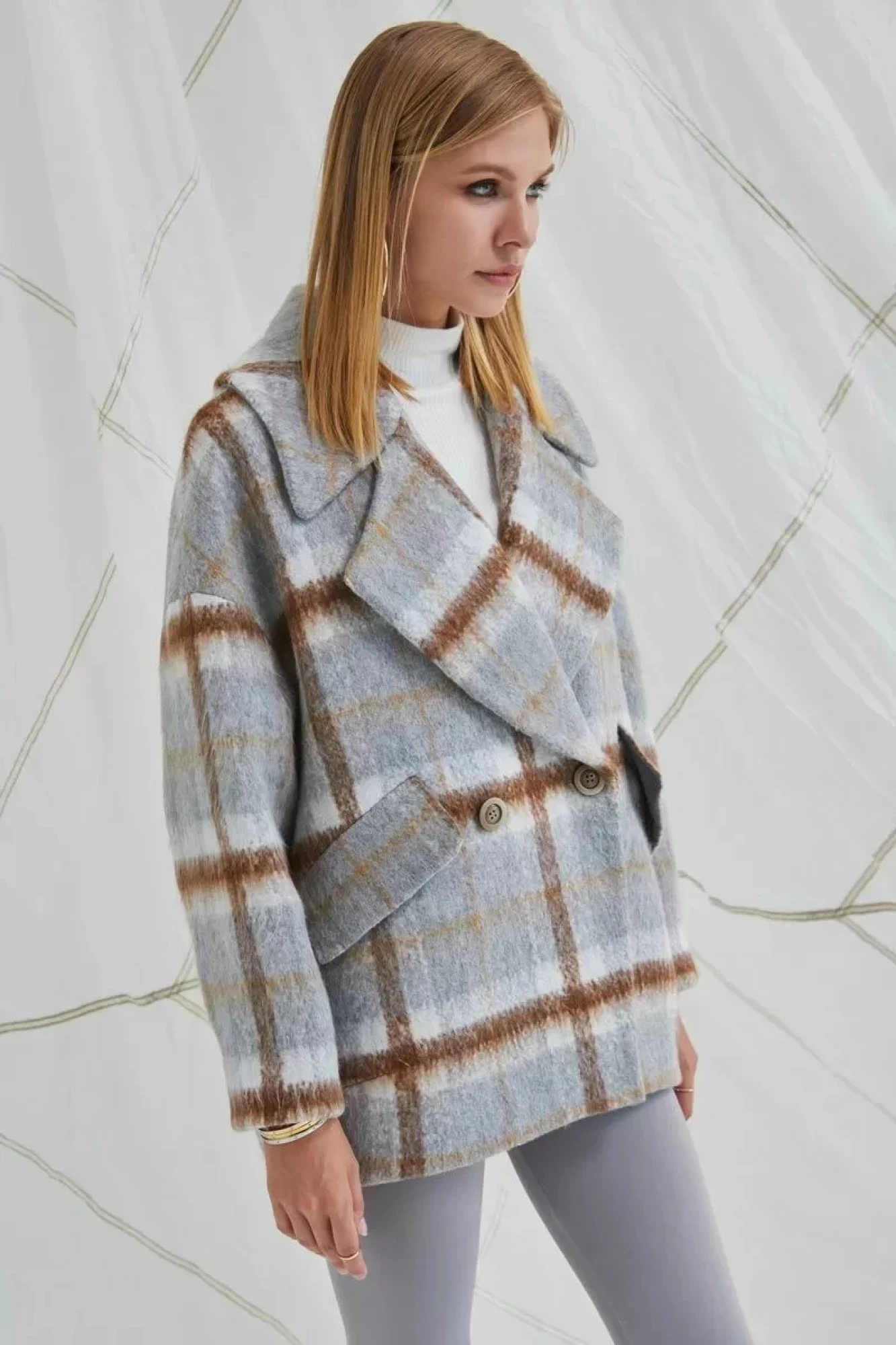 Полупальто из мягкой пальтовой ткани с ворсом, с дизайном крупная клетка, свободного кроя «оверсаиз», прямого силуэта, длиной чуть ниже линии бёдер, со спущенной линией плеча. Рукава длиной до запястья. Воротник пиджачного типа расширен по отлёту и по уступу лацкана, концы воротника стачиваются с лацканом по уступу. Детали переда с наклонными карманами с листочкой. Спинка без особенностей. Застёжка центральная двубортная на четыре петли и пуговицы. Полупальто на подкладке.