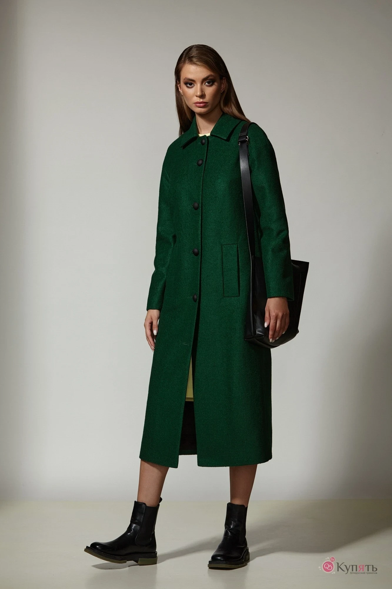 Пальто из пальтовой ткани на подкладке. Мягкая фактура ткани, сочный цвет, современный силуэт - все это приятно выделяет это пальто, делая его образцом элегантности и стиля. Воротник - отложной. Пройма спущена, рукава узкие. По переду - прорезные карманы с листочками. Спинка со средним швом и шлицей. Застегивается на пуговицы.
