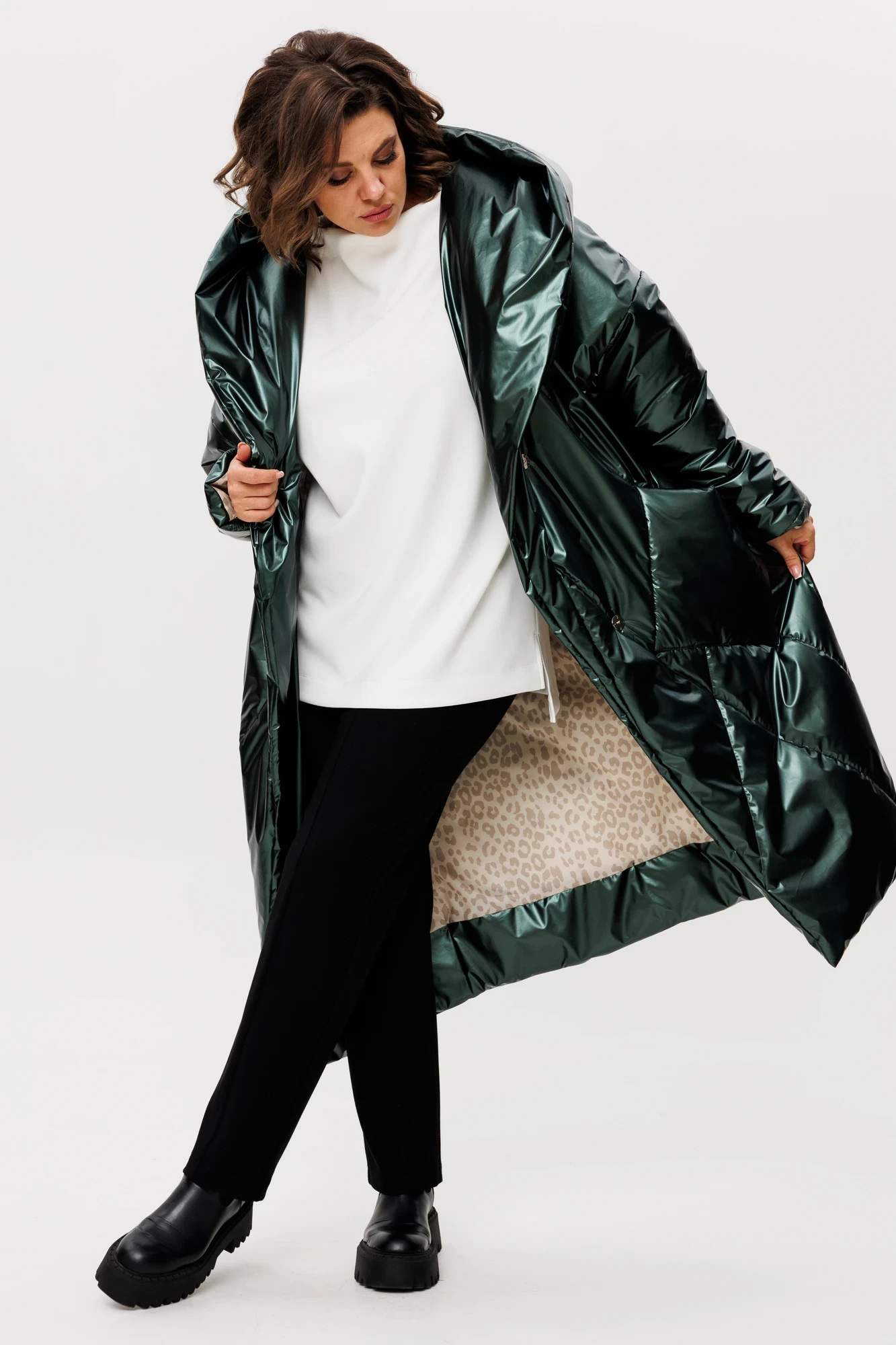 Пальто женское с капюшоном, на утеплителе ISOSOFT (200 г/м2 Бельгия), свободного силуэта зауженное к низу. По переду и спинке прострочены декоративные строчки. По переду расположены накладные карманы, плечо спущенное, рукав одношовный. Лацкан куртки переходит в капюшон. Пальто застегивается на пришивные кнопки.