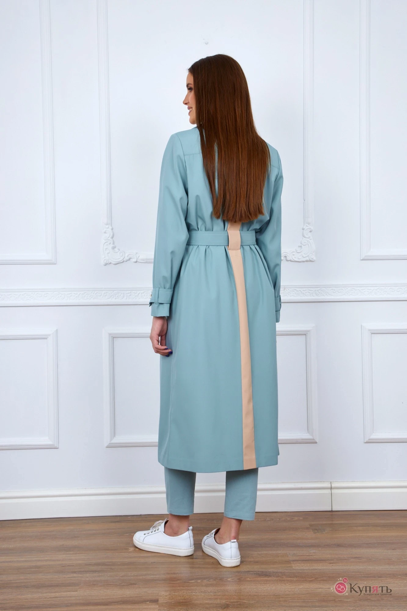 Плащ женский из плащевой ткани , комбинированный из двух цветов. 2-бортный ,с отложным воротником на стойке ,по переду в верхней части –кокетка ,по спинке –кокетка ,карманы « с листочкой»рукав втачной ,по спинке вставка вертикальная от горловины до низа изделия из ткни другого цвета,изделие под пояс из той же ткани с пряжкой ,шлевки по линии талии. Изделие на подкладке.