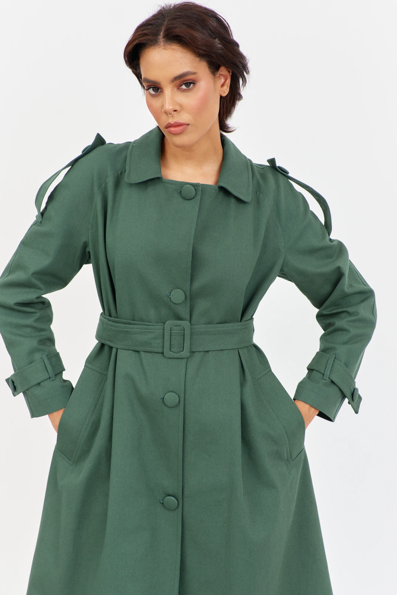 Плащ из плотного джинса в цвете зеленый мох. Характеристики: выполнен из джинсовой ткани в цвете зеленый мох, однобортная застежка на петли и пуговицы, на подкладке, функциональные карманы с листочкой, по рукавам и плечам паты на петли и пуговицы, по спинке разрез-шлица, рукава-регланы. Длина плаща 123 см, длина рукава+плечо 73 см.