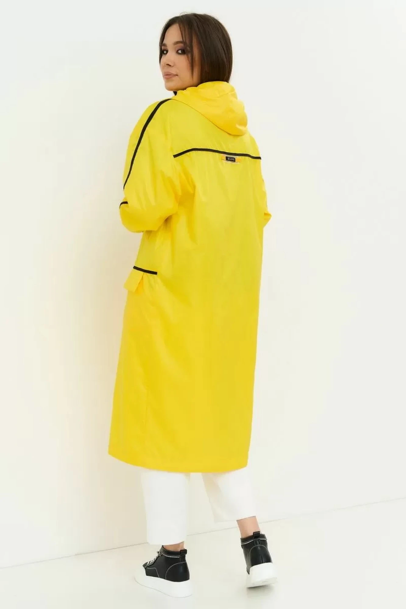 Стильный яркий плащ прямого кроя, без подкладки, с центральной застежкой на молнию. Рукав спущен, дополнен притачной трикотажной манжетой. Плащ дополнен капюшоном и боковыми карманами.