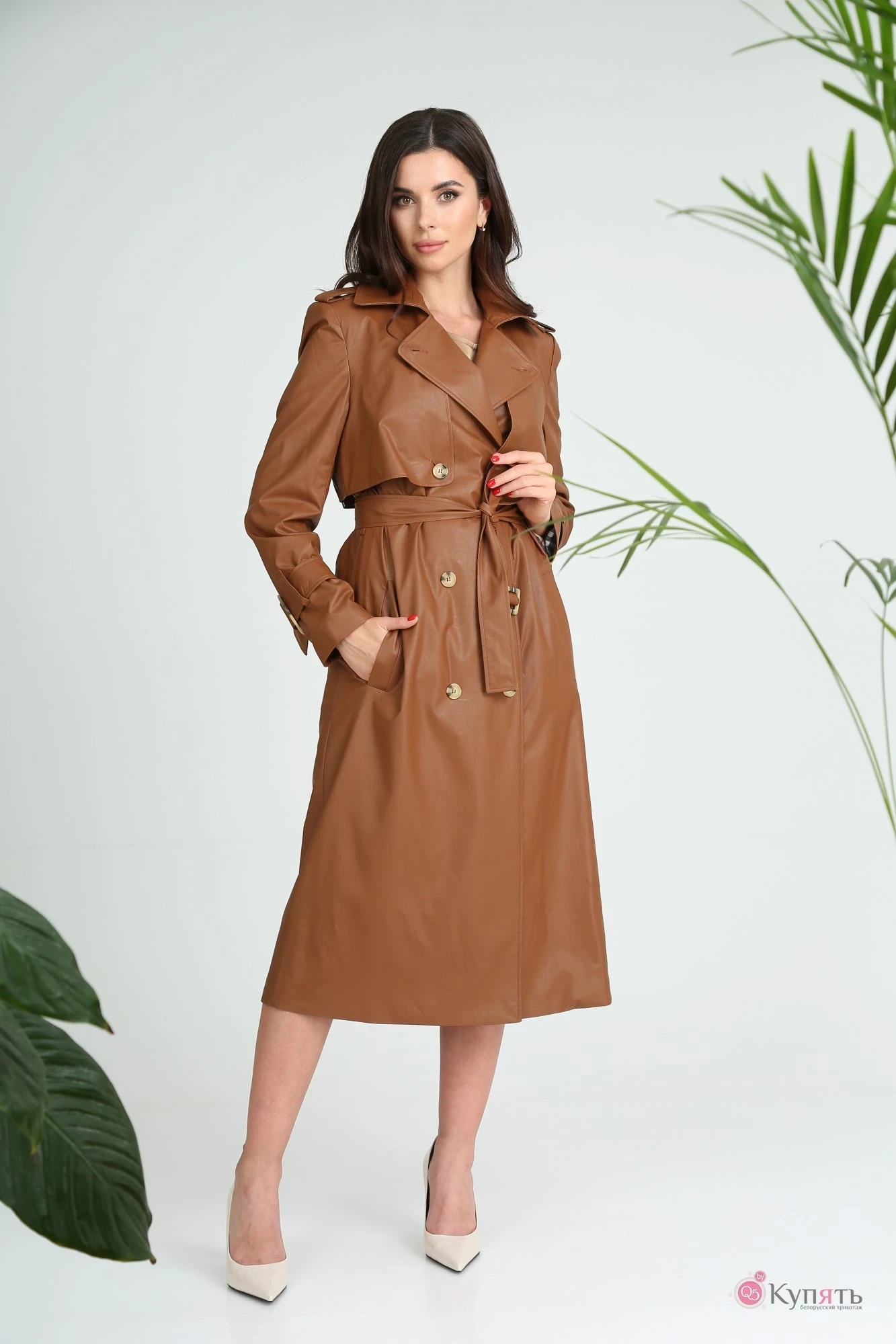 Плащ женский из экокожи прямого силуэта с центральной двубортной застежкой на петли и пуговицы, на подкладке. Перед с отлетными кокетками. По переду обработаны карманы с листочками. Спинка со средним швом и отлетной кокеткой. Рукава двухшовные втачные. По низу рукавов расположены паты с петлей и пуговицей , протянутые в шлевки. Воротник пиджачного типа. По линии талии расположены широкие шлевки, в которые протянут ремень с пряжкой. На плечевых швах обработаны паты со шлевкой, застегивающиеся на петлю и пуговицу. Длина по среднему шву спинки- 116см. Длина рукава- 64см.