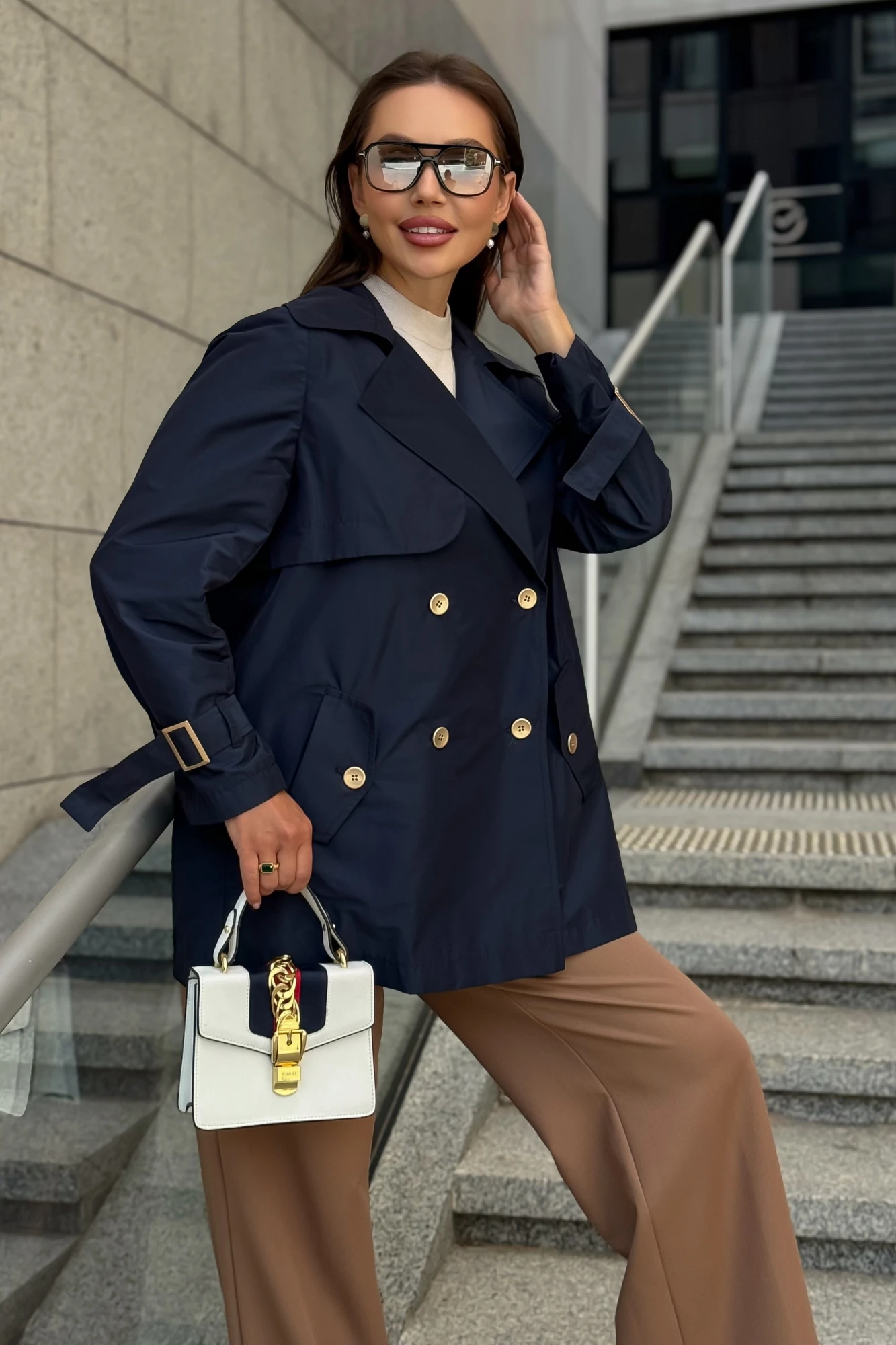 Длина вдоль середины спинки от шва втачивания воротника до низа - 75,5 см (±2,0 см), Ширина на уровне глубины проймы -61,5 см (±1,0 см), Ширина на уровне линии талии - 67,0 см (±1,0 см), Ширина на уровне линии бедер - 75,0 см (±1,0 см), Длина рукава - 62,5 см (±1,0 см), Ширина рукава вверху - 21,5 см (±1,0 см), Ширина рукава по низу - 16,5 см (±0,5 см), Длина плеча - 12,5 см (±0,5 см).
