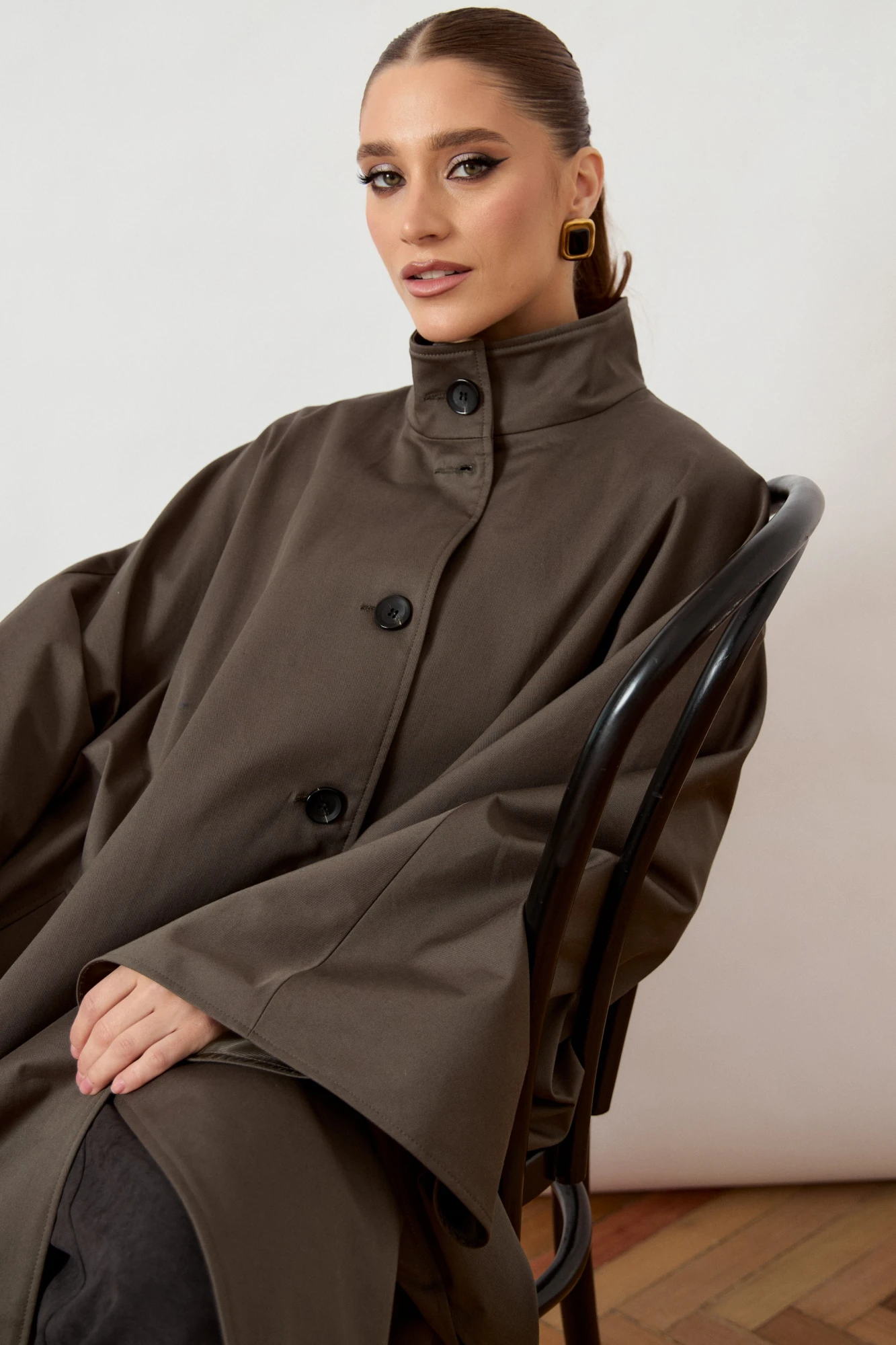 Тренч женский, свободного силуэта, из костюмно-плащевой ткани. Модель с воротником-стойкой и застежкой на петли и пуговицы. Изделие дополнено объемной отлетной кокеткой по переду и спинке, имитирующей кейп. Рукав цельнокроеный, переходящий в широкую форму, с разрезами в нижней части для свободы движения. Перед с вертикальными прорезными карманами в швах. Изделие на подкладке.