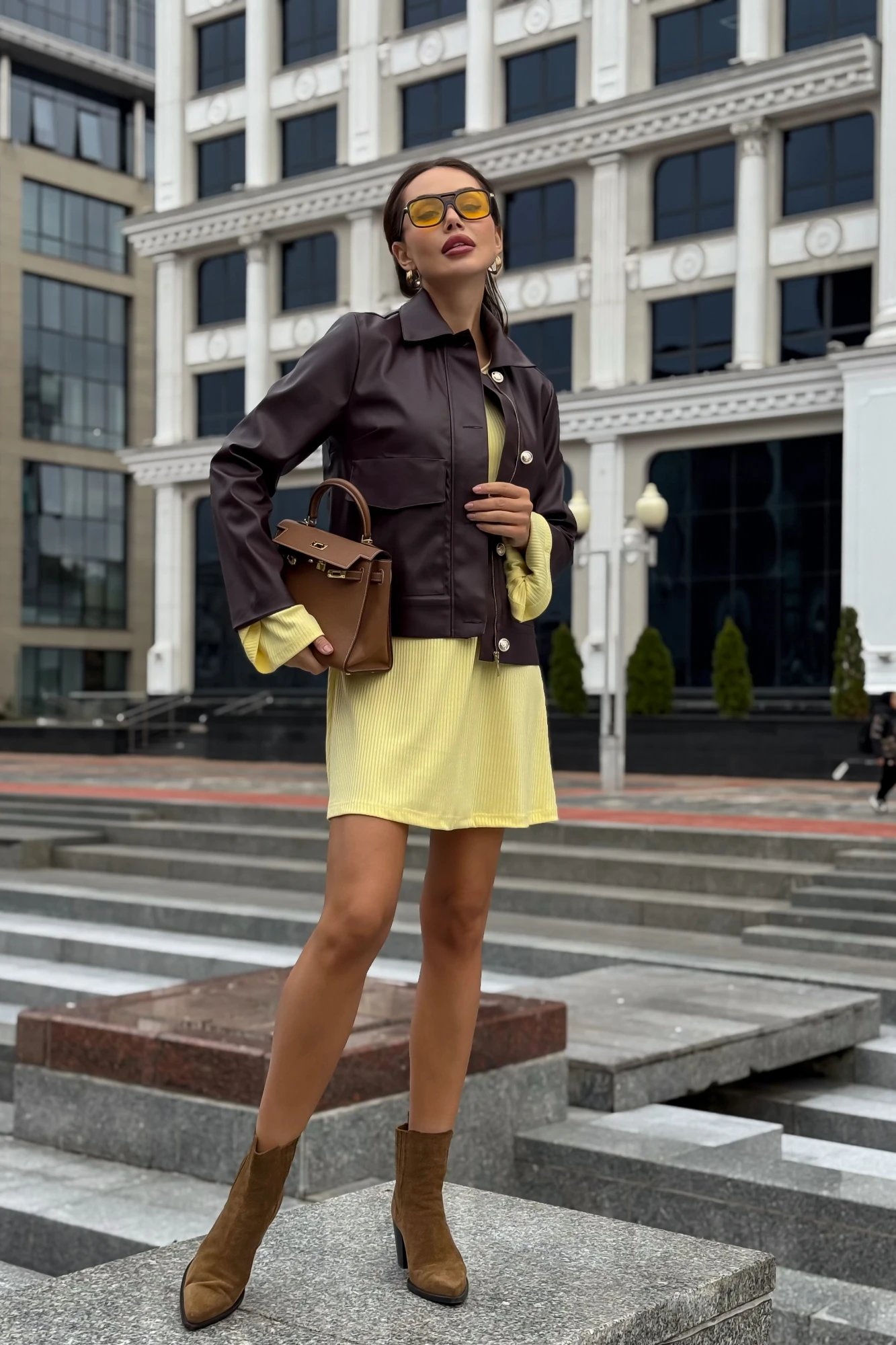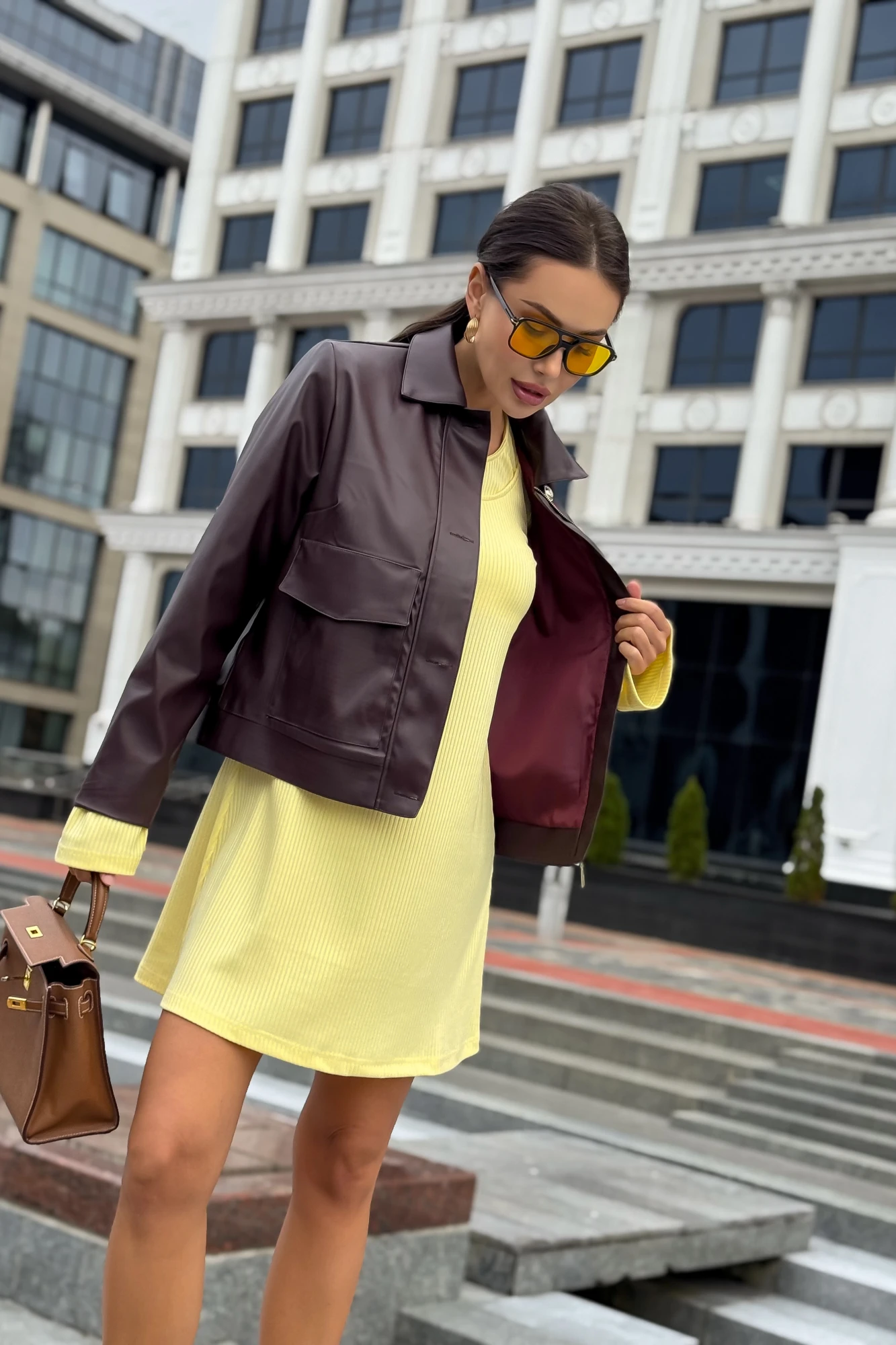 Жакет однобортный, на подкладке, выполнен из эко-кожи. Обработан молнией разъёмной молнией по центру переда, закрывающейся планкой с пуговицами. Воротник тложнй, рубашечного типа. Рукава втачные одношвные, прямые. По передним половинкам обрабтаны накладные карманы с клапаном.