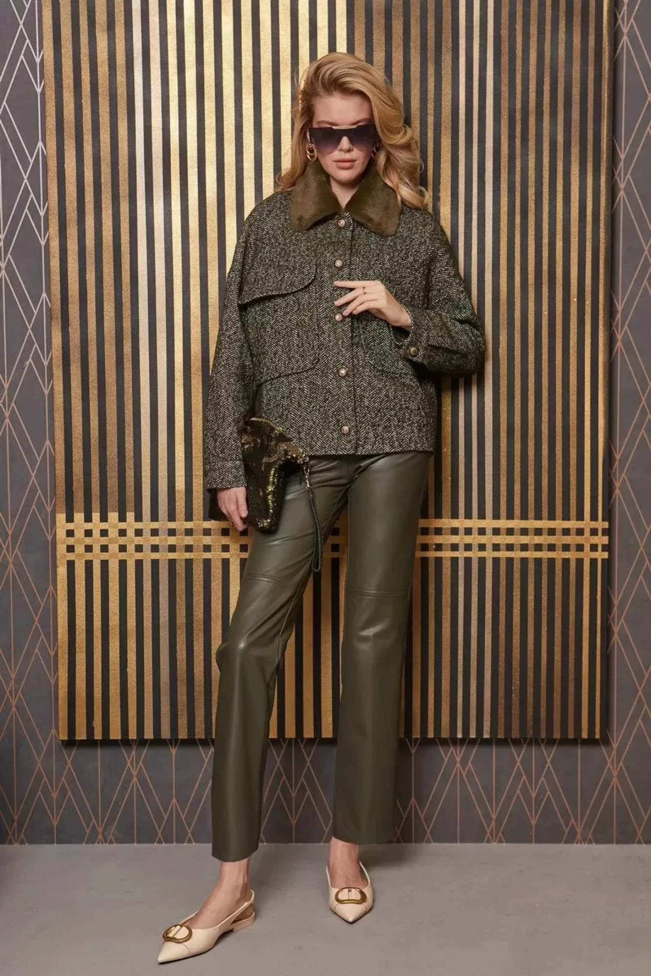 Жакет из мягкой твидовой ткани пальтово-костюмного ассортимента силуэта «бочонок», свободного кроя «оверсаиз» со спущенной линией плеча, длиной ниже линии талии. Рукава двухшовные длиной до запястья, со складкой по шву притачивания манжет, со шлицей в локтевом шве. Застёжка манжет на петлю и пуговицу. Горловина округлой формы с отложным воротником со скруглёнными концами и съёмным воротником из исскуственного меха. Детали переда с вытачками по низу, с накладными карманами, на уровне груди, с наклонным входом в карман со стороны пройм и скруглёнными нижними углами. По верхнему краю карманов настрочены клапаны со скруглёнными углами. Спинка с вытачками по низу. Застёжка центральная на петли и пуговицы, низ и край борта прямой. Жакет на подкладке.