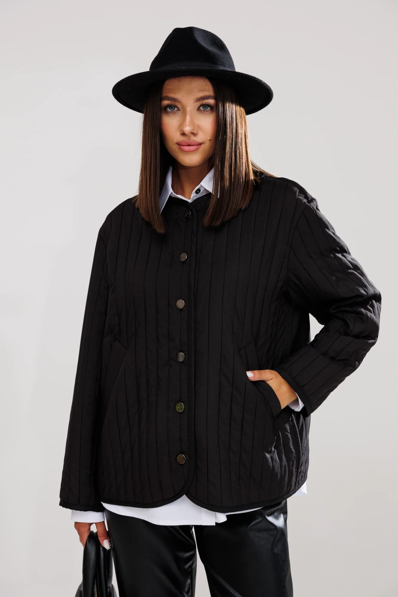Жакет на подкладке из актуального стеганого полотна, прямого свободного силуэта с прибавками умеренного направления oversize. Линия плеча чуть спущена. Рукав втачной, двухшовный. Длина рукава 60-62 см.