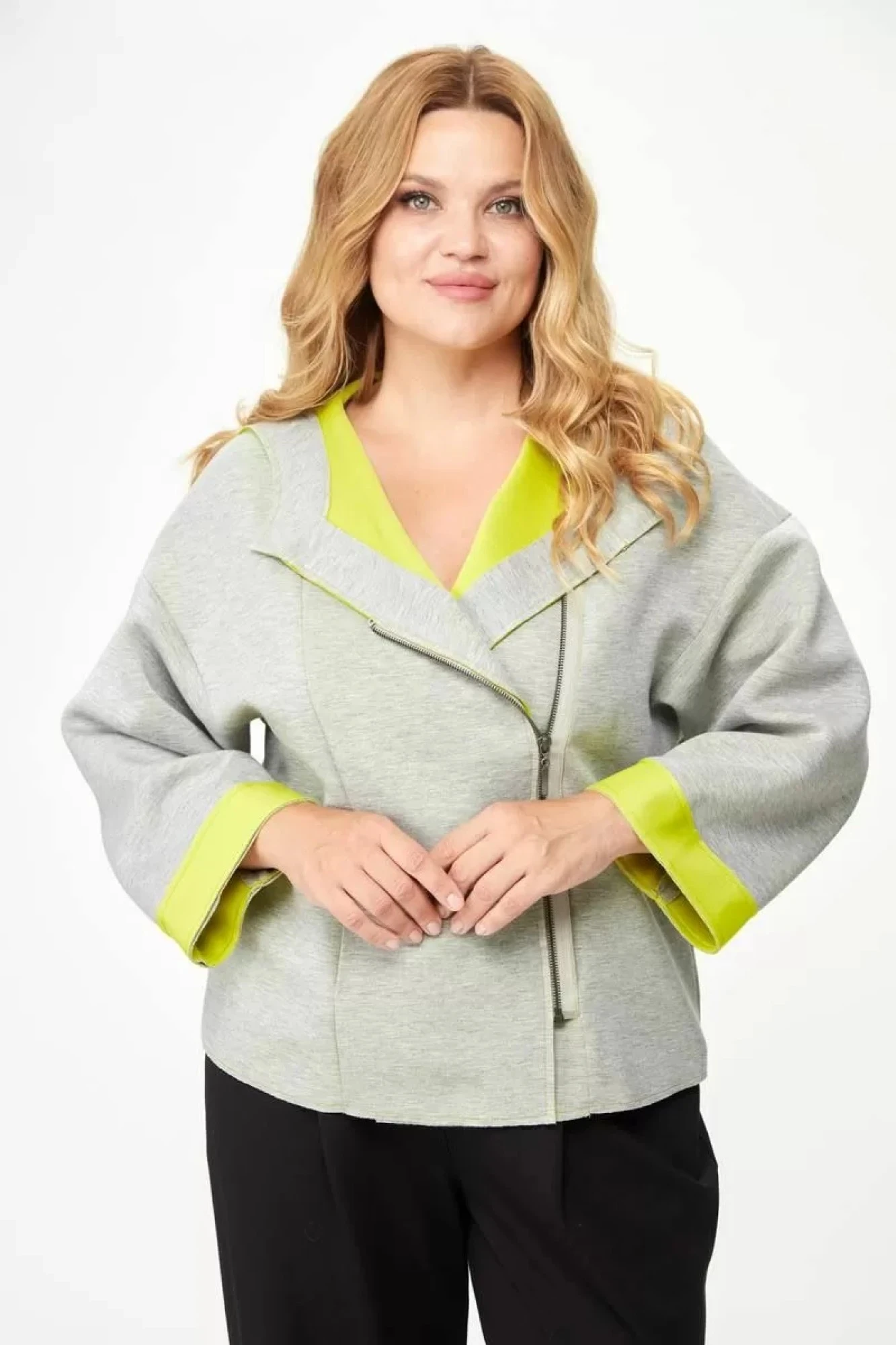 Универсальный и уютный укороченный женский жакет изготовлен из трикотажного полотна, станет незаменимым в вашем гардеробе, удобен и для прогулок и для похода в офис, смело сочетается с любым стилем одежды и обувью. Жакет с капюшоном и объемными рукавами, по переду застегивается на асимметричную застежку — молнию, имеются карманы. Внутренняя часть капюшона и манжеты выполнены из контрастной ткани. Спинка цельная. Края жакета, рукава, борта и капюшона с открытыми срезами и отделочной строчкой