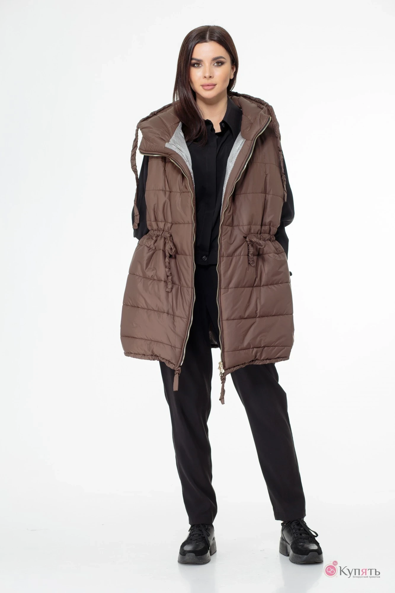 Прямой силуэт с завышенными прибавками по обхватам для удобной носки и комбинирования жилета с верхней одеждой.Объёмный капюшон,застёжка на разъемную молнию по всей длине.В области талии,по низу и в капюшоне шнурки,обтянутые тканью верха для фиксирования обхватов по вашему желанию.