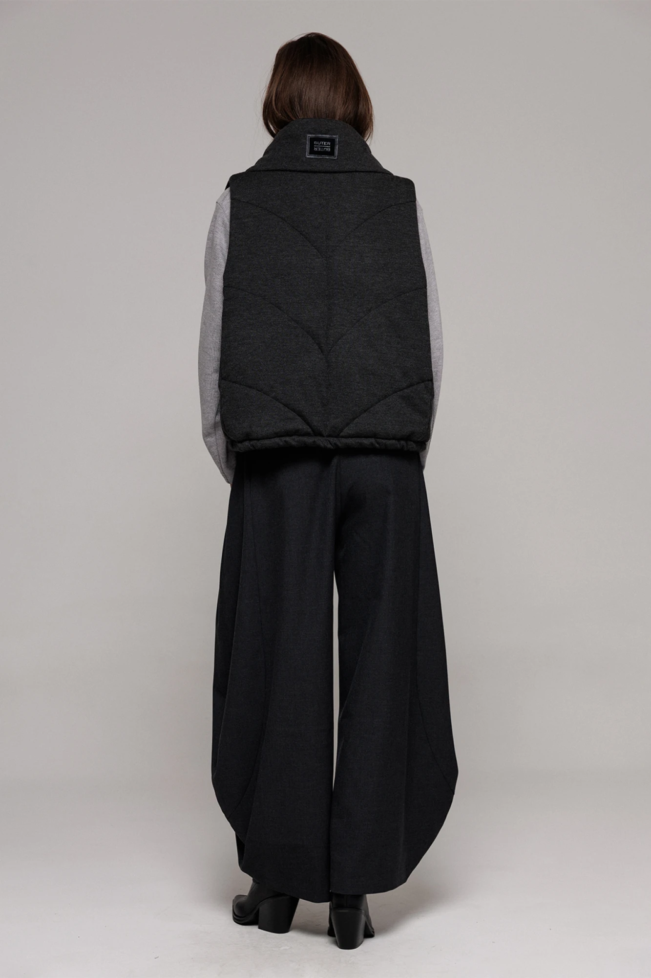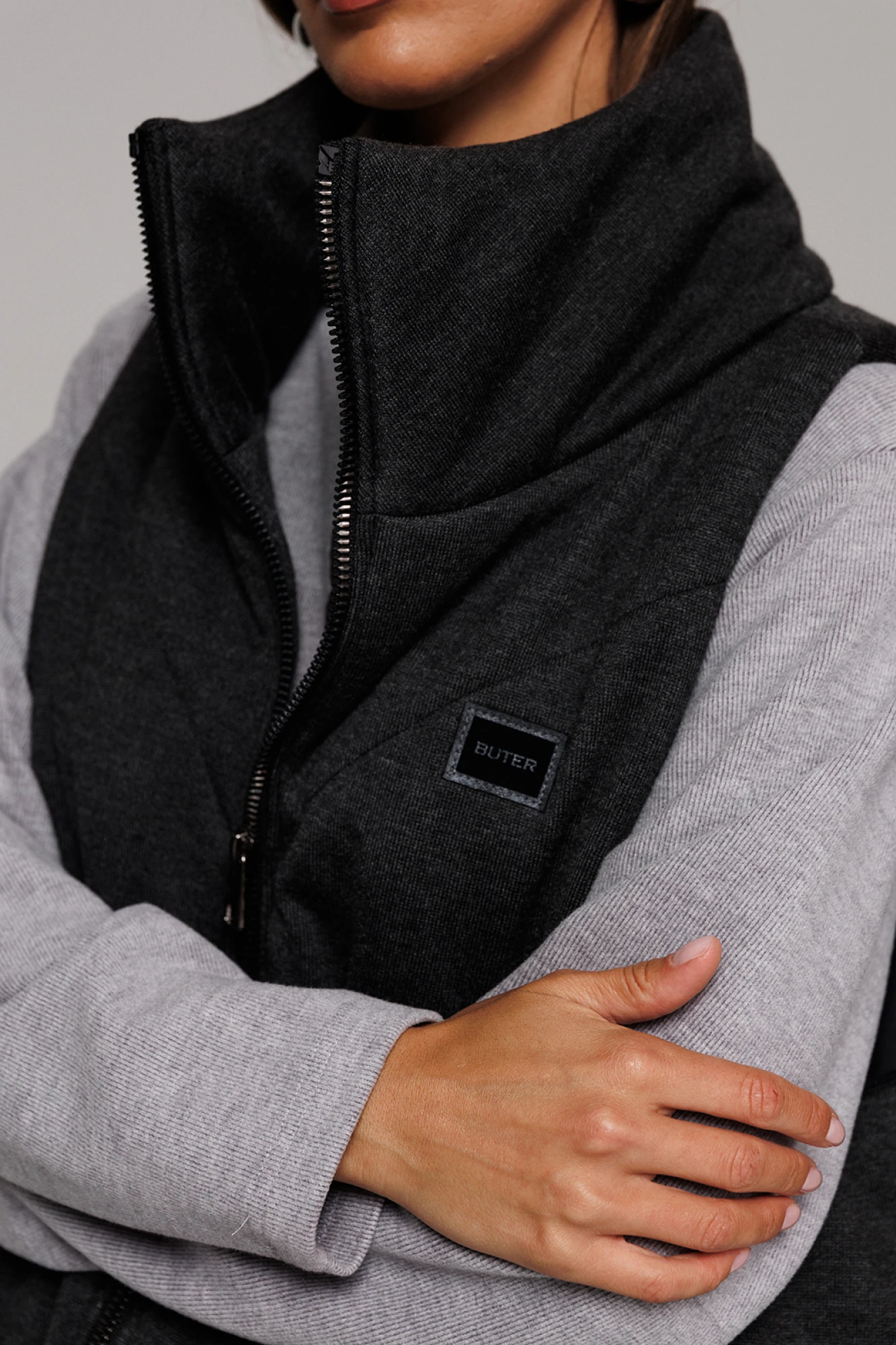 Жилет короткий свободного силуэта слегка заужен к низу. Полочка с центральной застежкой на тесьму-молнию, с отрезным бочком и карманом в шве притачивания бочка. По низу жилета вставлена эластичная тесьма с фиксатором на спинке. Воротник стойка с нашивкой "BUTER" по спинке, и на бочке. Жилет из трикотажного полотна с фигурной стежкой на синтепоне (isosoft 150г/м²) и подкладке.