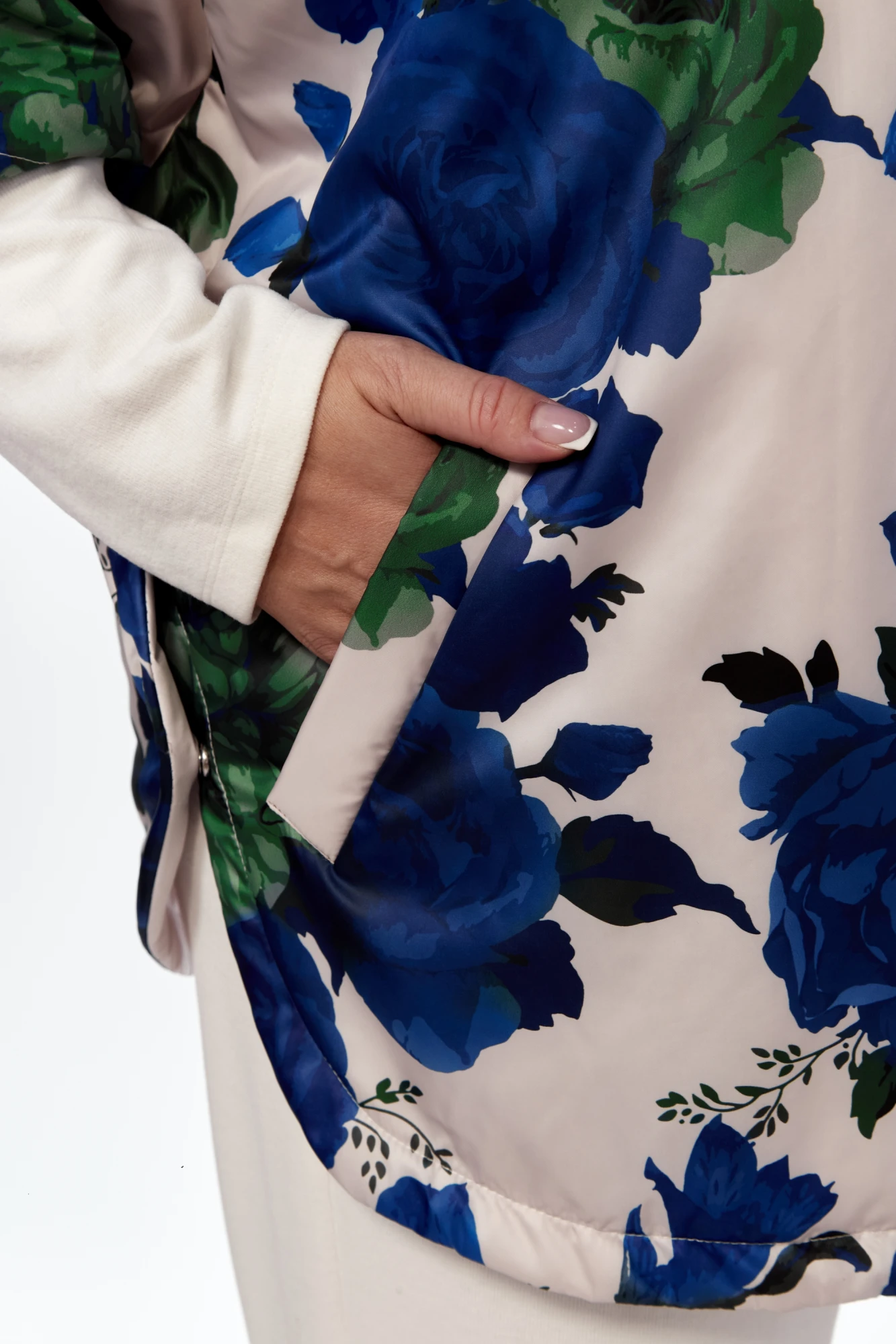 Пончо 2-ух стороннее с центральной бортовой застежкой "молния". Черная сторона: по переду и спинке выполнена горизонтальная стежка. Перед с накладными карманами "кенгуру". Вторая сторона: перед с боковыми прорезными карманами "с листочкой". По боковым швам застежка на три кнопки образует разрезы округлой формы. Воротник-капюшон. По краю отделочная строчка на 2,5 см.