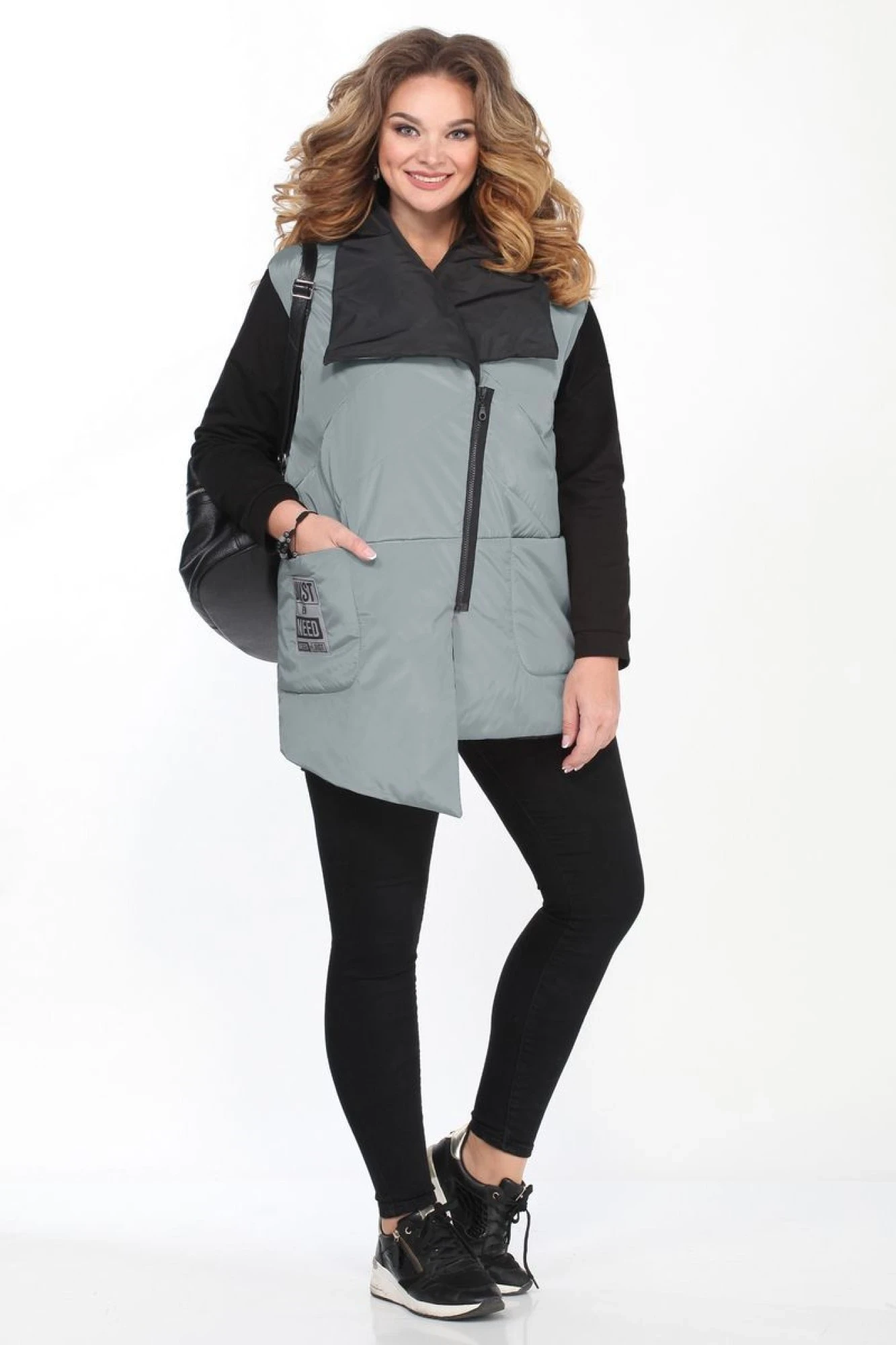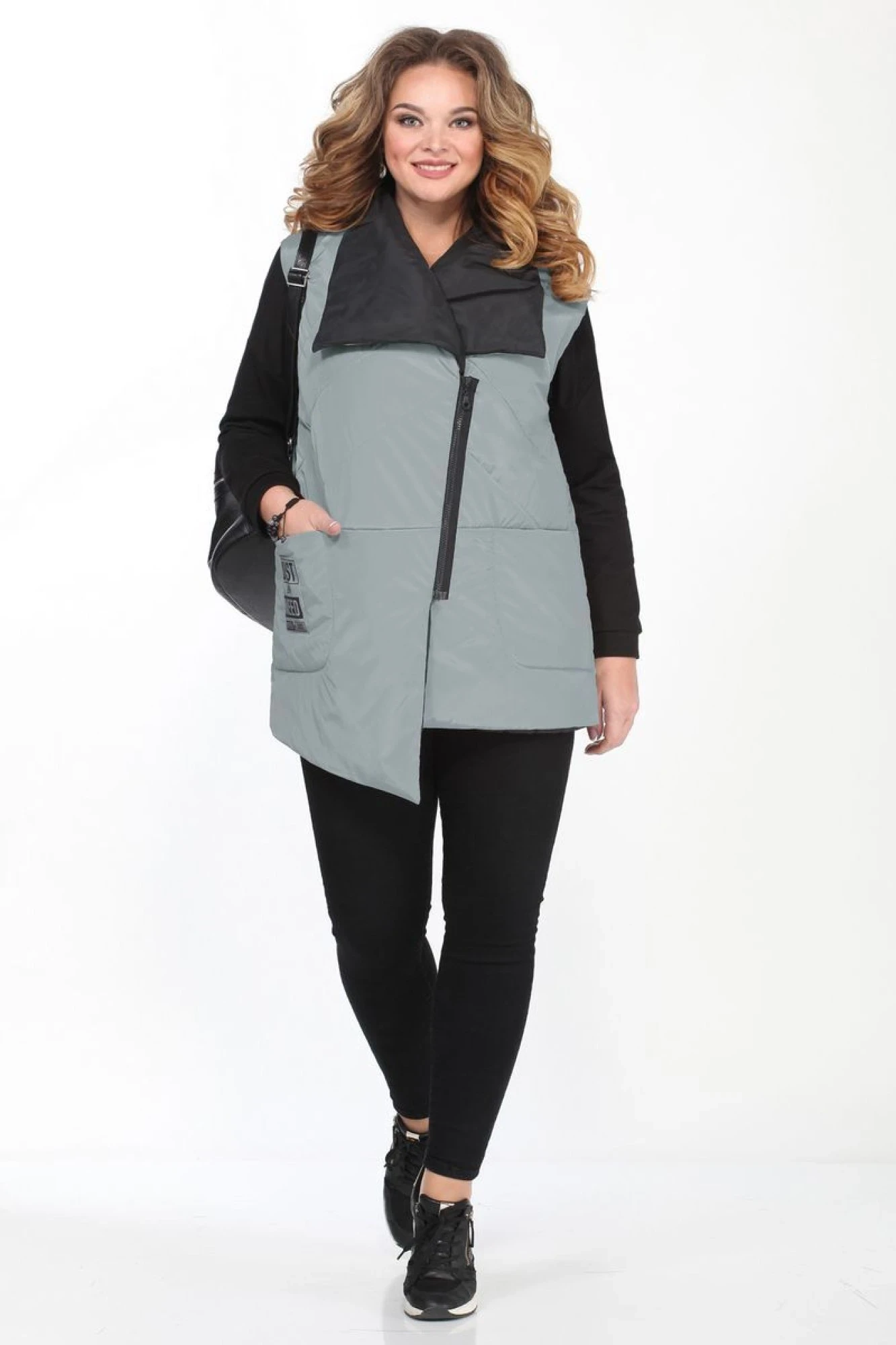 Жилет женский прямого силуэта,на синтепоне. Застежка ассиметричная на молнию. Воротник апаш. Перед отрезной по линии талии с карманами в шве. Полочка и спинка простеганы в верхней части. Линия низа переда ассимметрична. Жилет на тонкой подкладке. Длина по спинке 75,5 см.