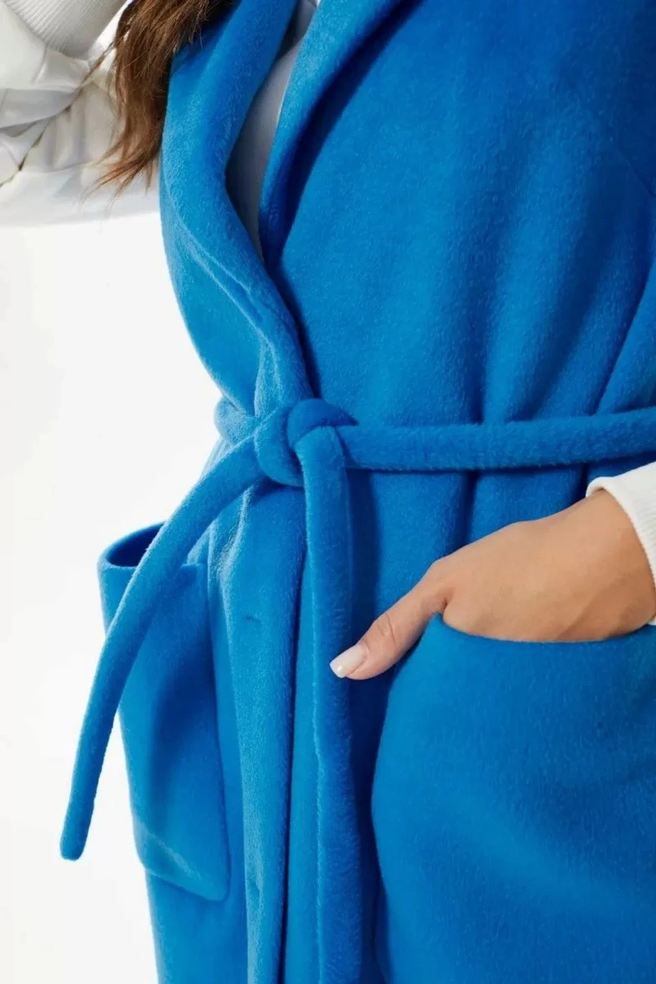 Жилет женский прямого силуэта. По переду застежка на пришивные кнопки и большире накладныце карманы.Воротник отложной на стойке. Жилет без утеплителя, на подкладке. Дополнинием служит пояс.