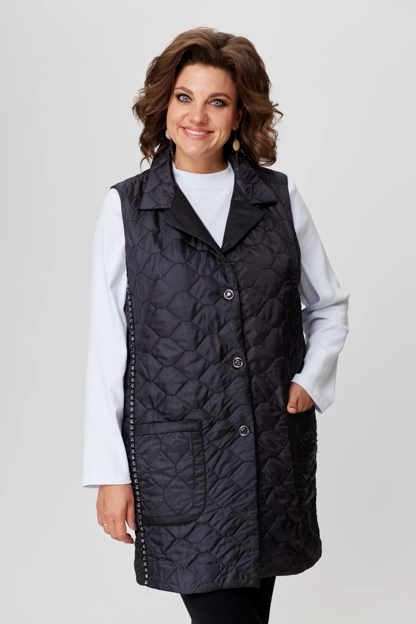 Жилет прямого силуэта из стеганой ткани на тонком синтепоне. По переду рельефы и накладные карманы. По боковым рельефам настрочена декоративная тесьма с пайетками и бусинами. Застежка пуговицы. Спинка прямая с центральным швом. По полочке нагрудные вытачки. Жилет на трикотажной подкладке. Длина жилета 102 см.