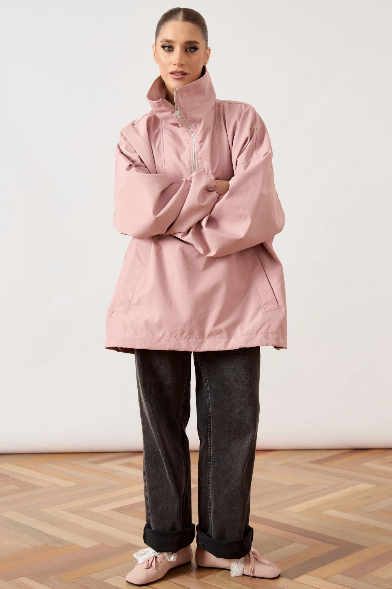 Анорак женский, свободного силуэта, из плотной плащевой ткани. Изделие со спущенной линией плеча и воротником-стойкой. Перед с отрезной кокеткой и центральной застежкой на молнию до середины груди. В нижней части переда расположен накладной карман «кенгуру» с наклонным входом. Спинка цельнокроеная, удлиненная относительно переда. Рукав широкий, одношовный, втачной, по низу собран на эластичную тесьму (резинку). Низ изделия свободный, с небольшим расширением к низу.