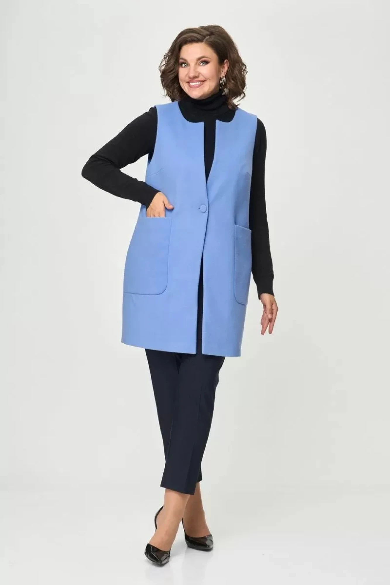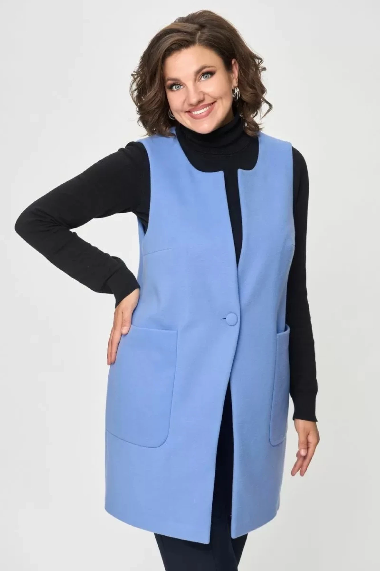 Жилет прямого силуэта с нагрудными вытачками. Мягкий кашемир в нежном голубом цвете и идеальный конструкторский замысел позволили идеально подчеркнуть фигуру в любом размере.