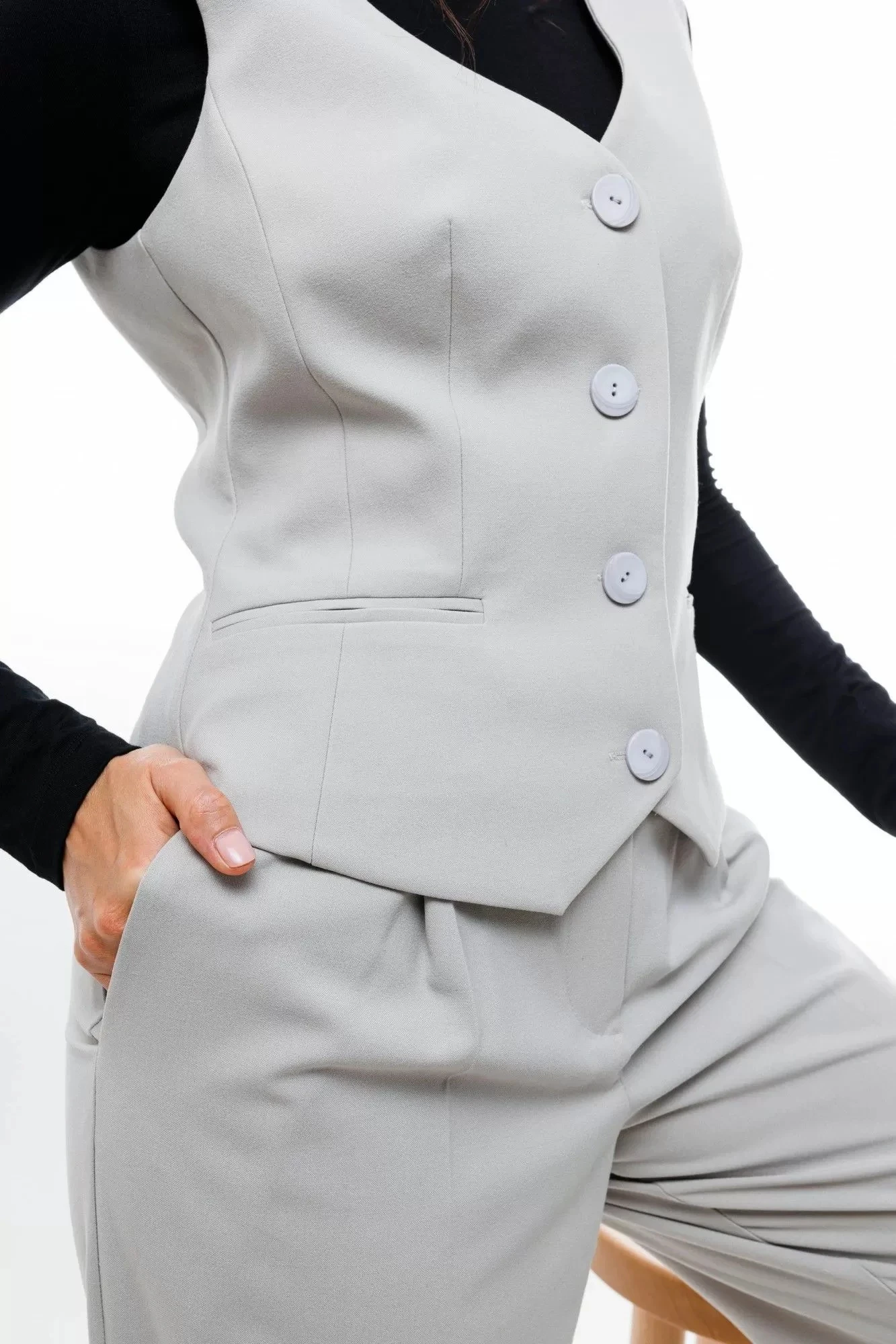 Универсальный базовый жилет умеренного объема прилегающего силуэта. На полочках нагрудные вытачки переведены в рельефы и линию кармана. Карманы прорезные в рамку. На спинке плечевые вытачки и рельефы. В рельефах, на уровне талии два хлястика с застежкой на полукольца. По низу детали спинки фигурный вырез. Жилет на подкладке. Застежка центральная на четыре петли и пуговицы.
