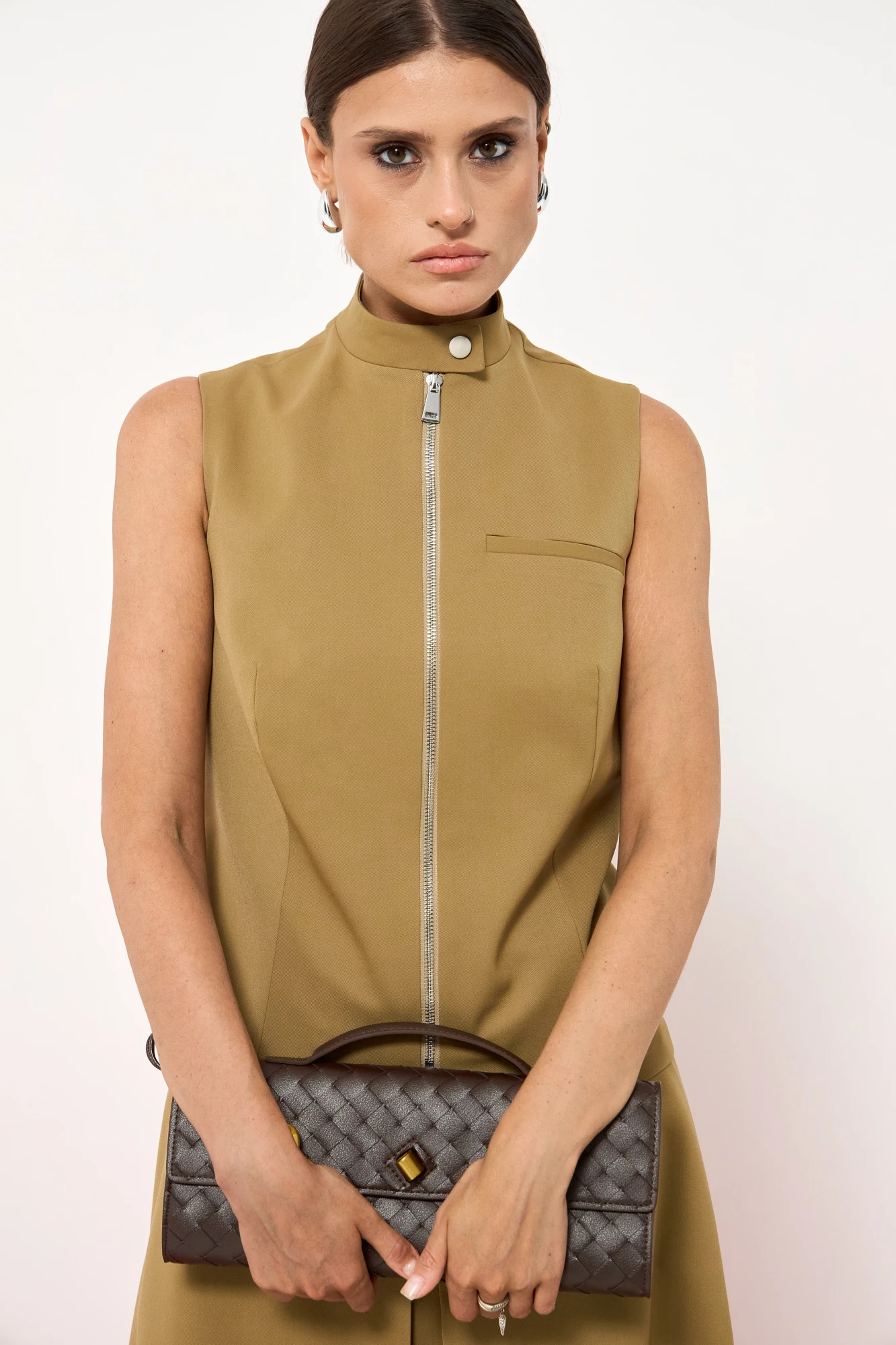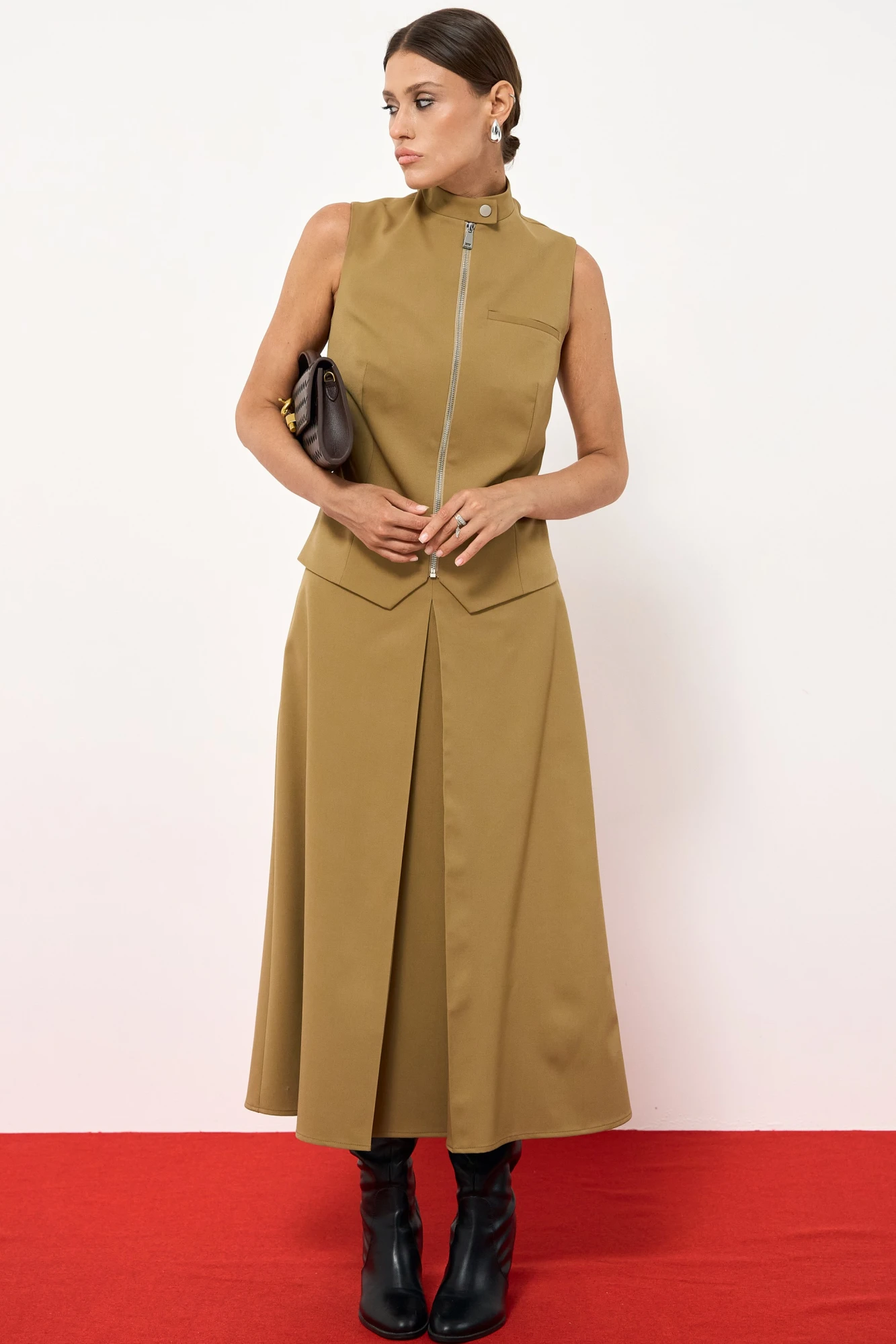 Жилетка прямого, слегка приталенного силуэта, из костюмной ткани, по переду на молнии, горловина стойка на кнопке, по переду на груди имитация кармана с листочкой. По переду и по спинке выточки. Жилет на подкладке.