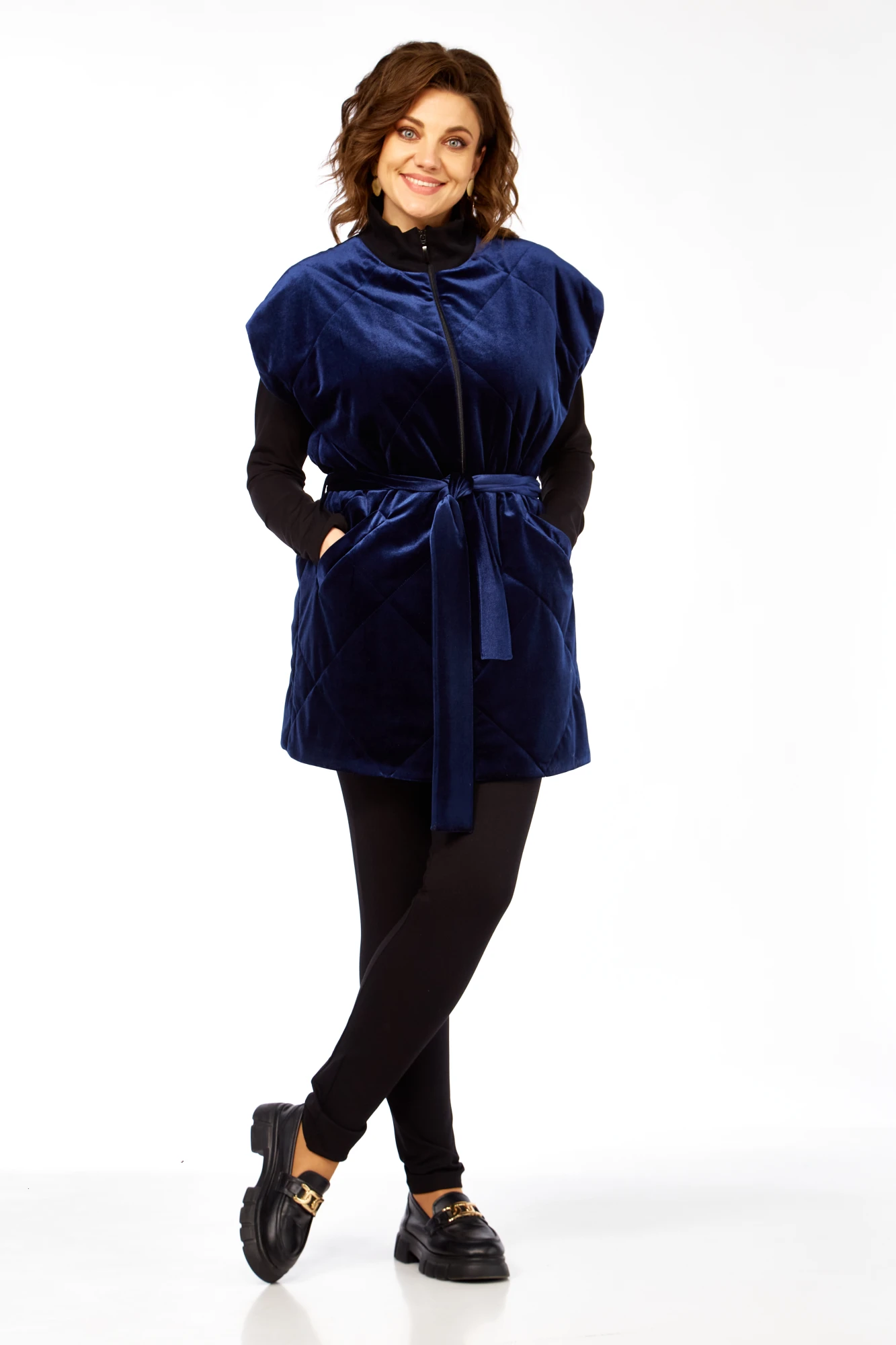 Жилетка свободного силуэта, прямого кроя, удлиненная, с декоративной стежкой ромб. Воротник стойка из кошкорсе. Центральная застежка молния. На переде прорезные карманы с листочками. Низ прямой. Спущенная линия плеча. В комплекте пояс. В боковые швы в районе талии вставлены шлевки для пояса, пояс можно убрать, что не повлияет на внешний вид жилетки. Длина плеча-20,5см, длина по спинке-85см. Параметры модели: обхват груди-98см, обхват бедер-110см, размер изделия на модели 50.