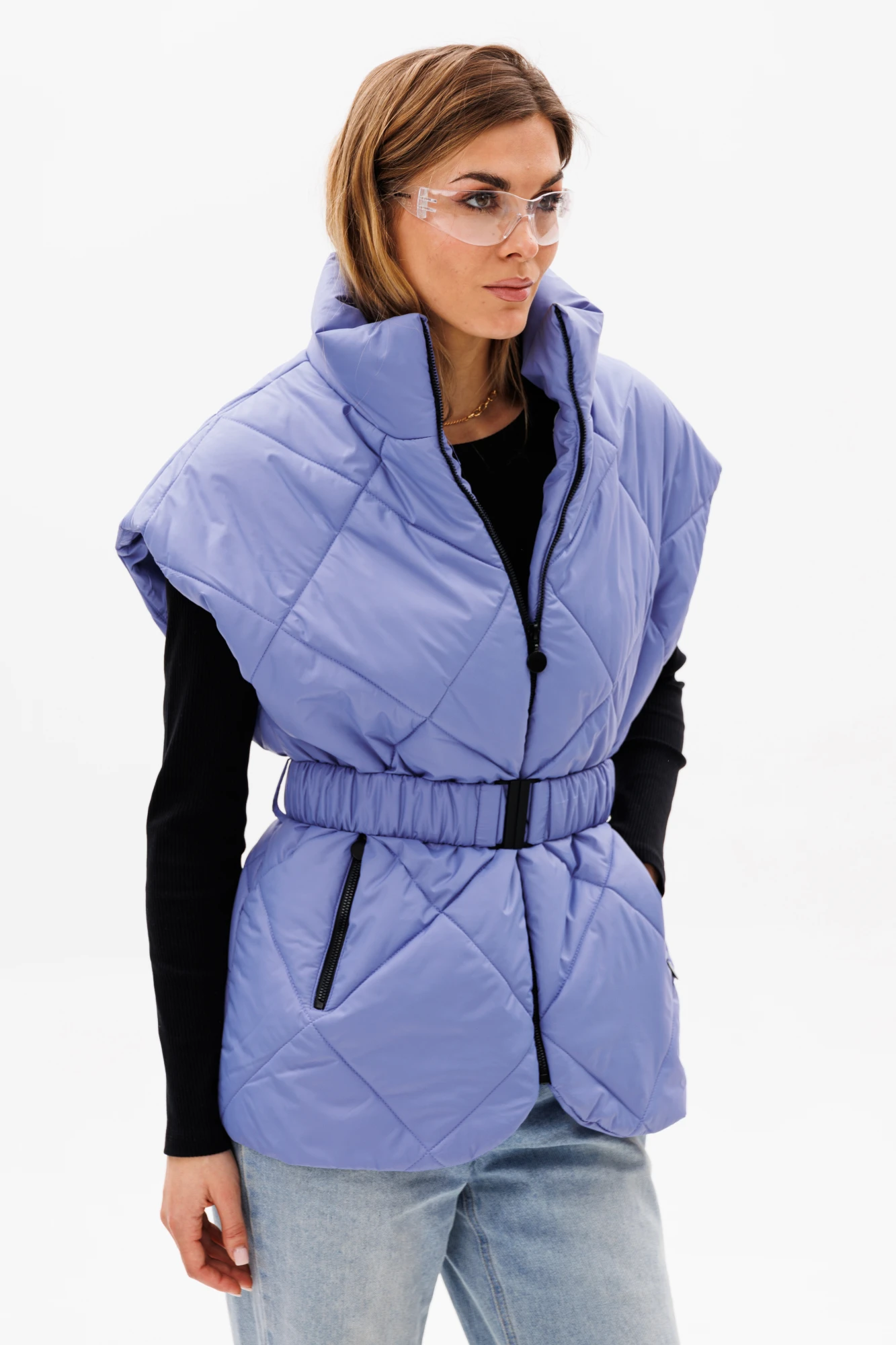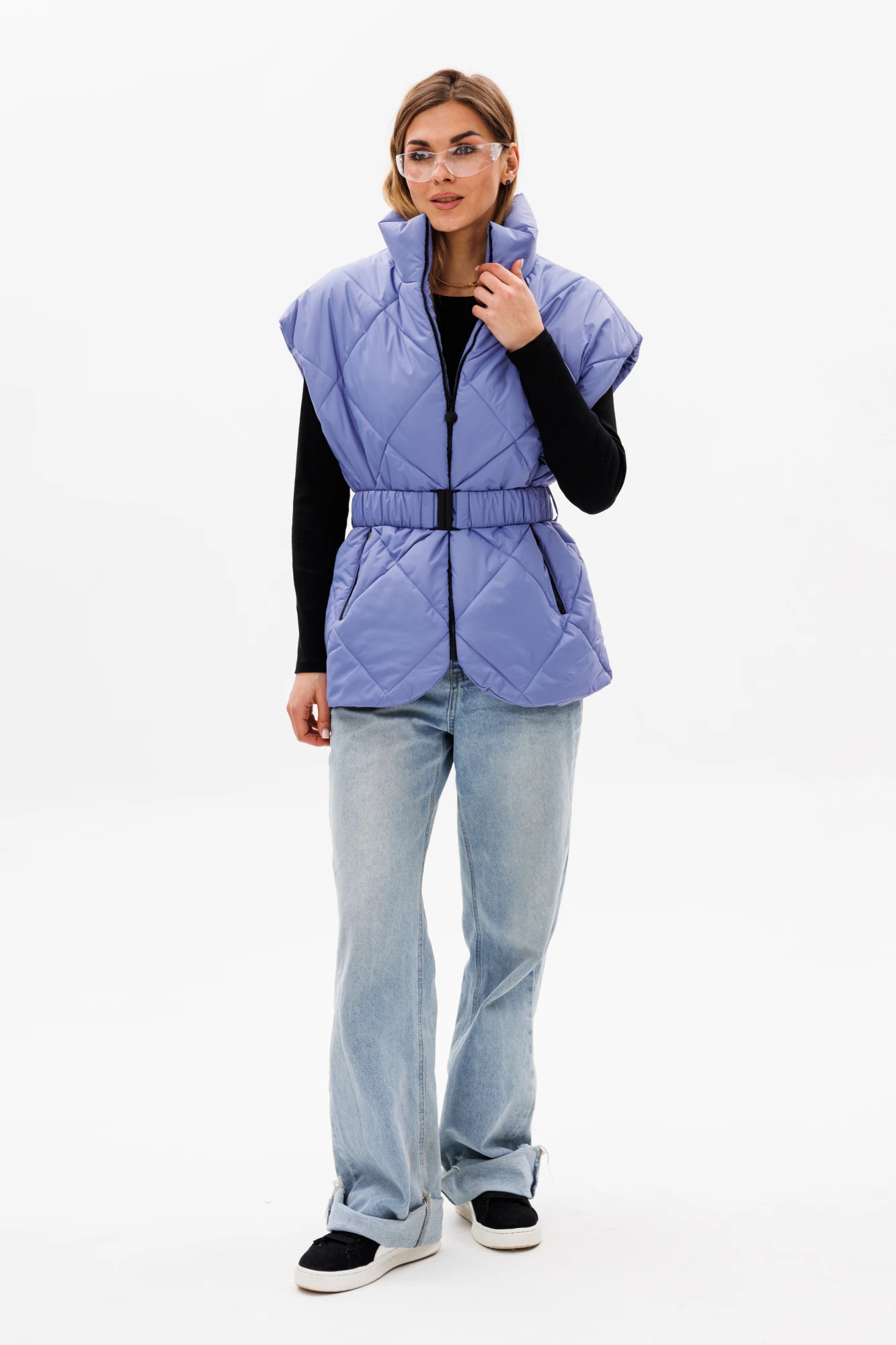 Жилет женский стёганный из плащёвой ткани на синтепоне. Прямого силуэта под пояс с эластичной тесьмой и пряжкой. Стёжка ромбами, со спущенным плечевым швом, с карманами по переду на молнии, с воротником-стойкой и застёжкой спереди на молнию.