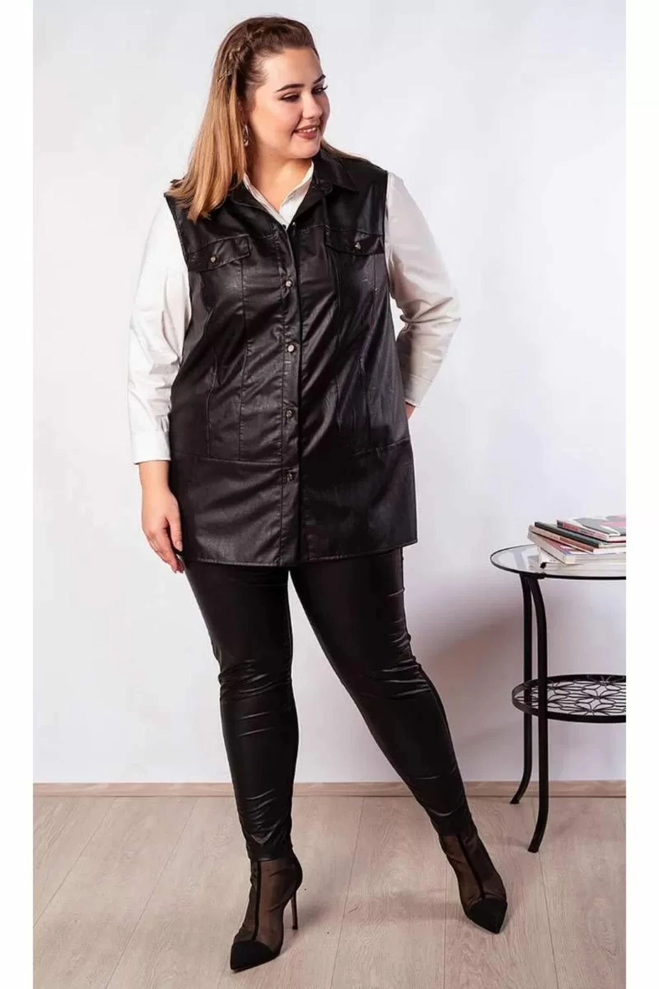 Стильный жилет рубашечного кроя из эко-кожи – безусловный тренд этого года! Модные акценты: металлические пуговицы, имитация нагрудных карманов с клапаном, создают интересный образ. А с кожаной юбкой (мод. 21164 и мод. 21121) или леггинсами (мод. 21169 и мод. 21165) получается современный комплект, который без сомнения полюбится многим. Идеальный вариант для офиса, деловых встреч и прогулок с друзьями.