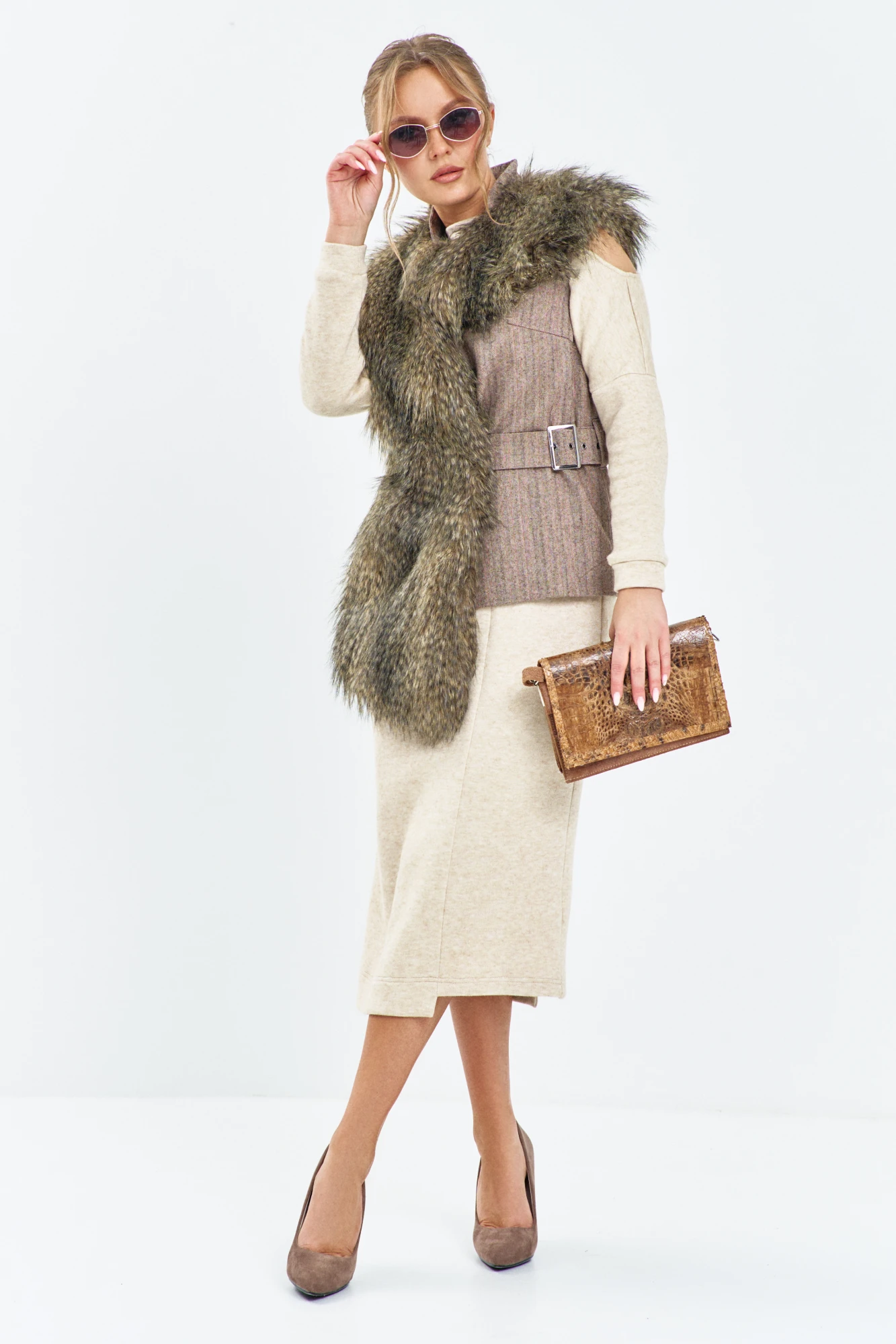 Жилет женский выполнен из сочетания тканей: искусственного меха и джинса, жилет асимметричного кроя. Горловина округлая с небольшим воротником- стойкой. На полочке из денима расположена выточка и пояс с регулировкой объема талии.