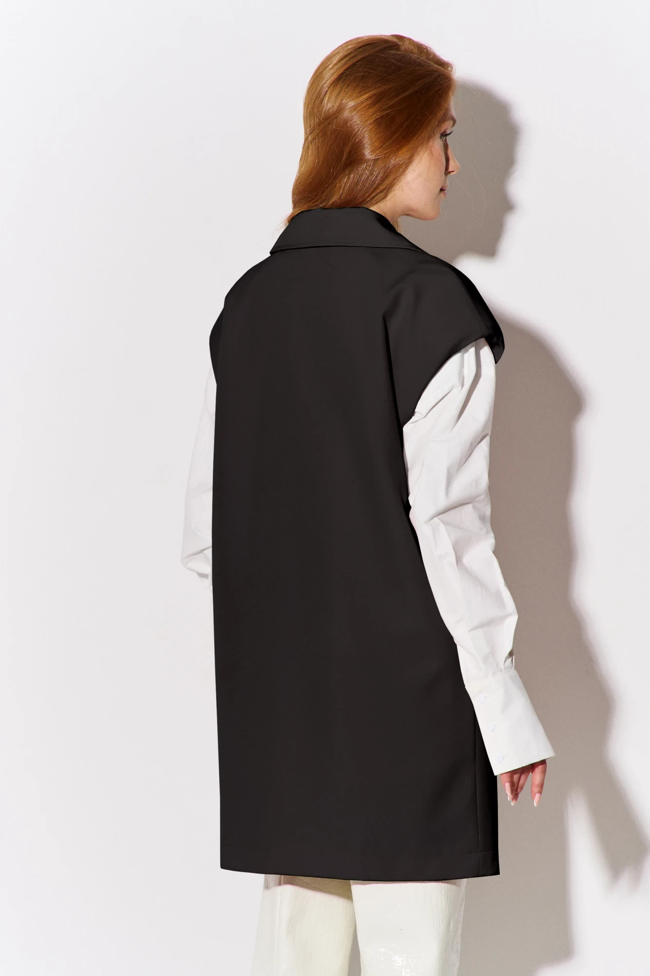 Жилет прямого кроя. Характеристики: выполнен из костюмной ткани в розовом цвете, двубортная застежка на петли и пуговицы, жилет на подкладке, функциональные карманы с листочкой. Длина жакета по переду 89,5 см.
