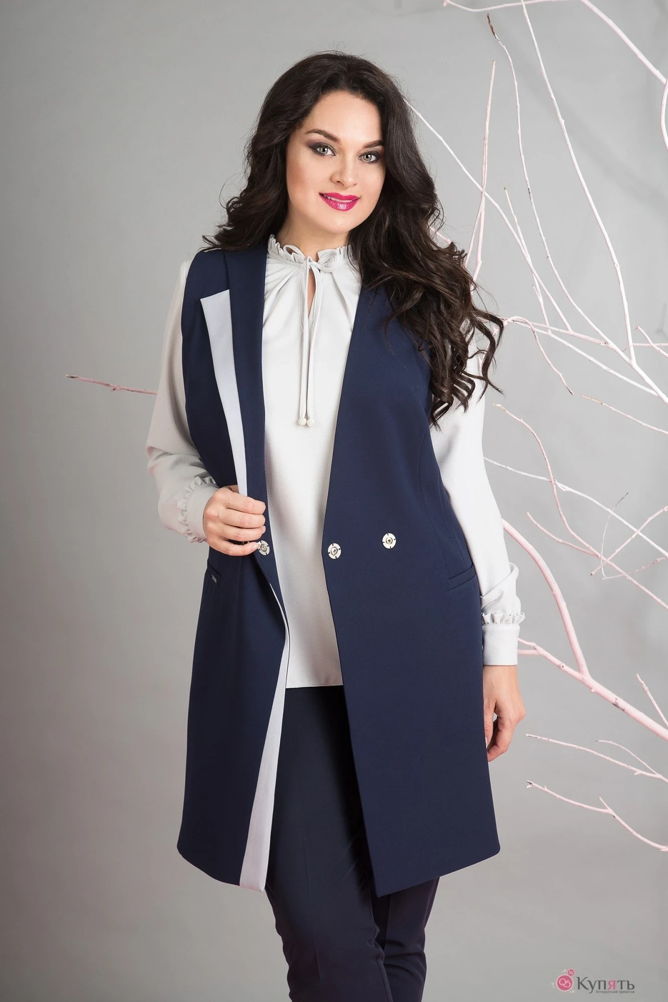 Стильный женский комплект в стиле BUSINESS CASUAL состоит из удлиненного жилета и блузки. Жилет на подкладке с двубортной застежкой на декоративные кнопки. Модель с ассиметричным лацканом из отделочной ткани. Полочка с прорезными карманами в рамку. По боковым швам по низу разрезы. Элегантная блузка прямого силуэта с V – образным вырезом, с заложенными складками. Рукав длинный с притачной манжетам. На петлю и пуговку. По горловине и рукаву притачана декоративная рюша с завязкой на бант.