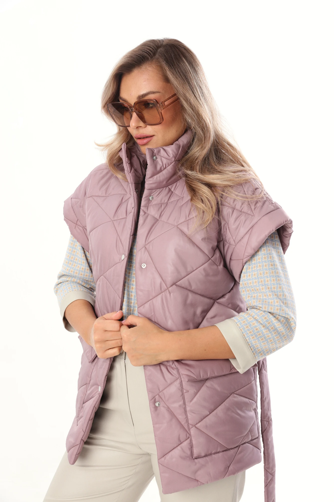 Жилет свободного силуэта из объемной стеганой ткани. Жилет на подкладке. Спущенная линия плеча, застёжка на кнопки. По переду широкие накладные карманы с клапаном с боковым входом для удобства. В комплекте идёт пояс из основной ткани. Длина по спинке 71-73 см.