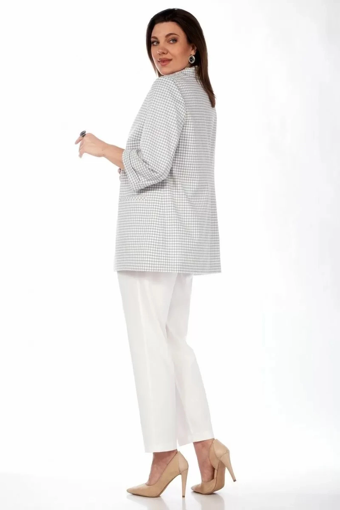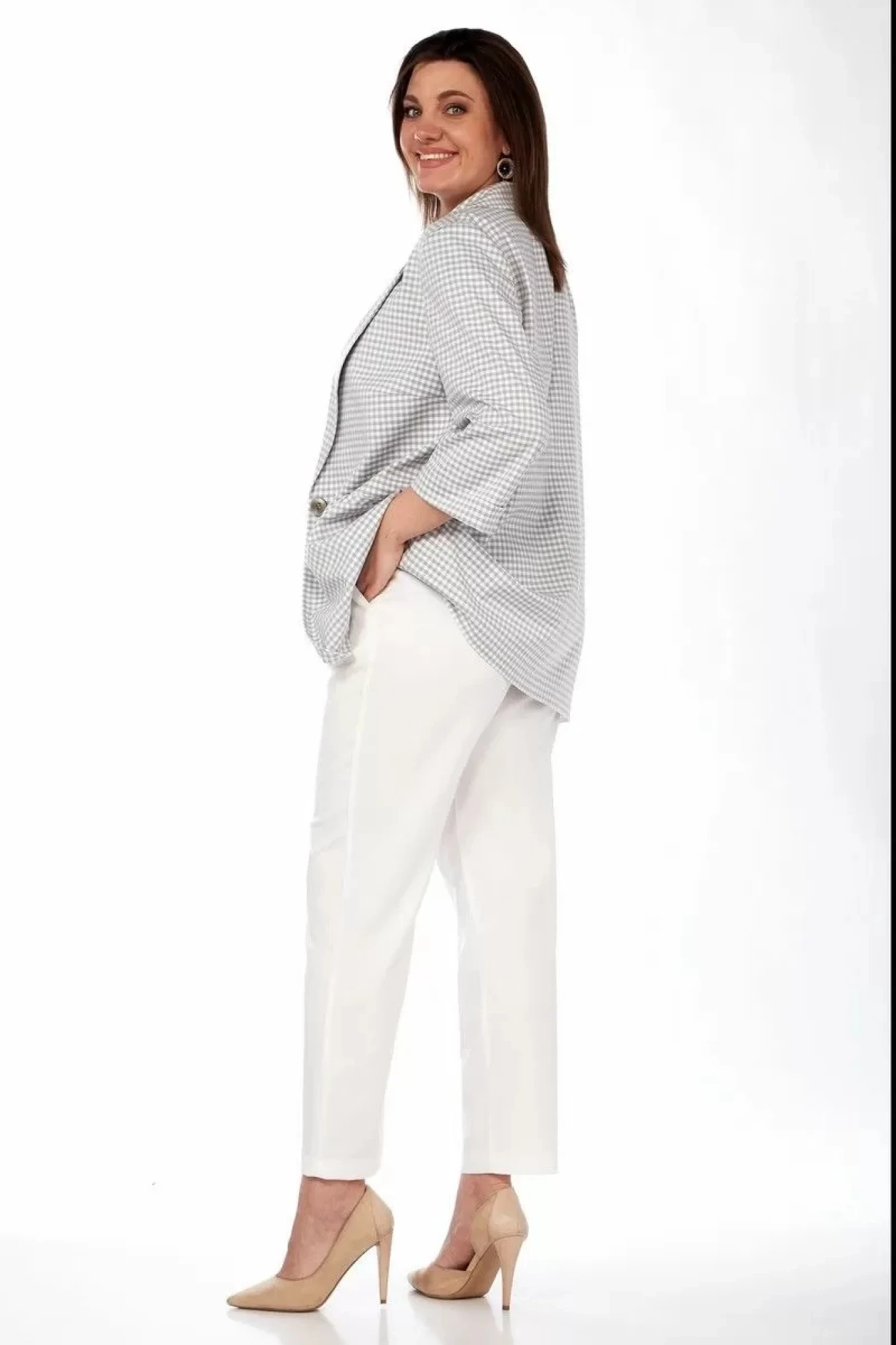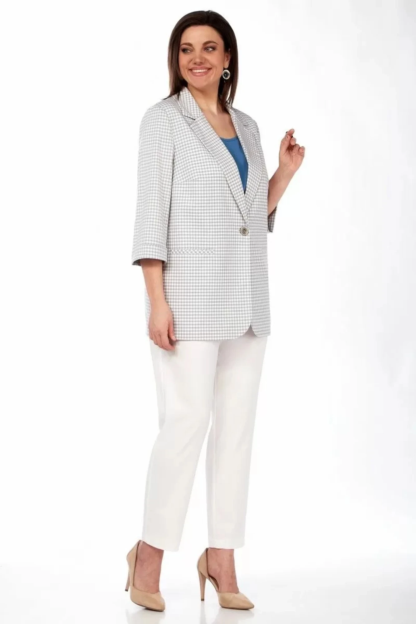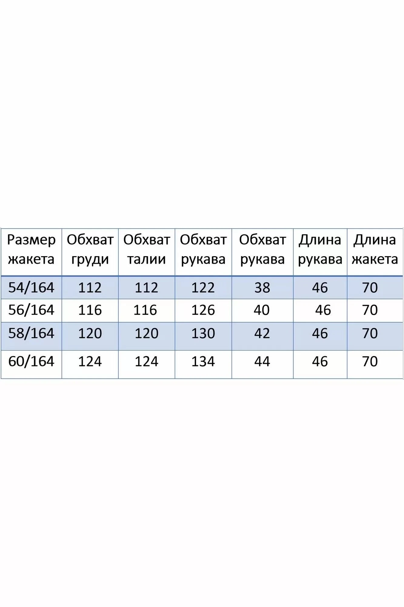 Жакет прямого силуэта, на подкладке с центральной застежкой на петли-пуговицы. По переду на уровне талии выполнены прорезные карманы с листочкой. Рукав втачной, двухшовный с цельнокроеной манжетой.