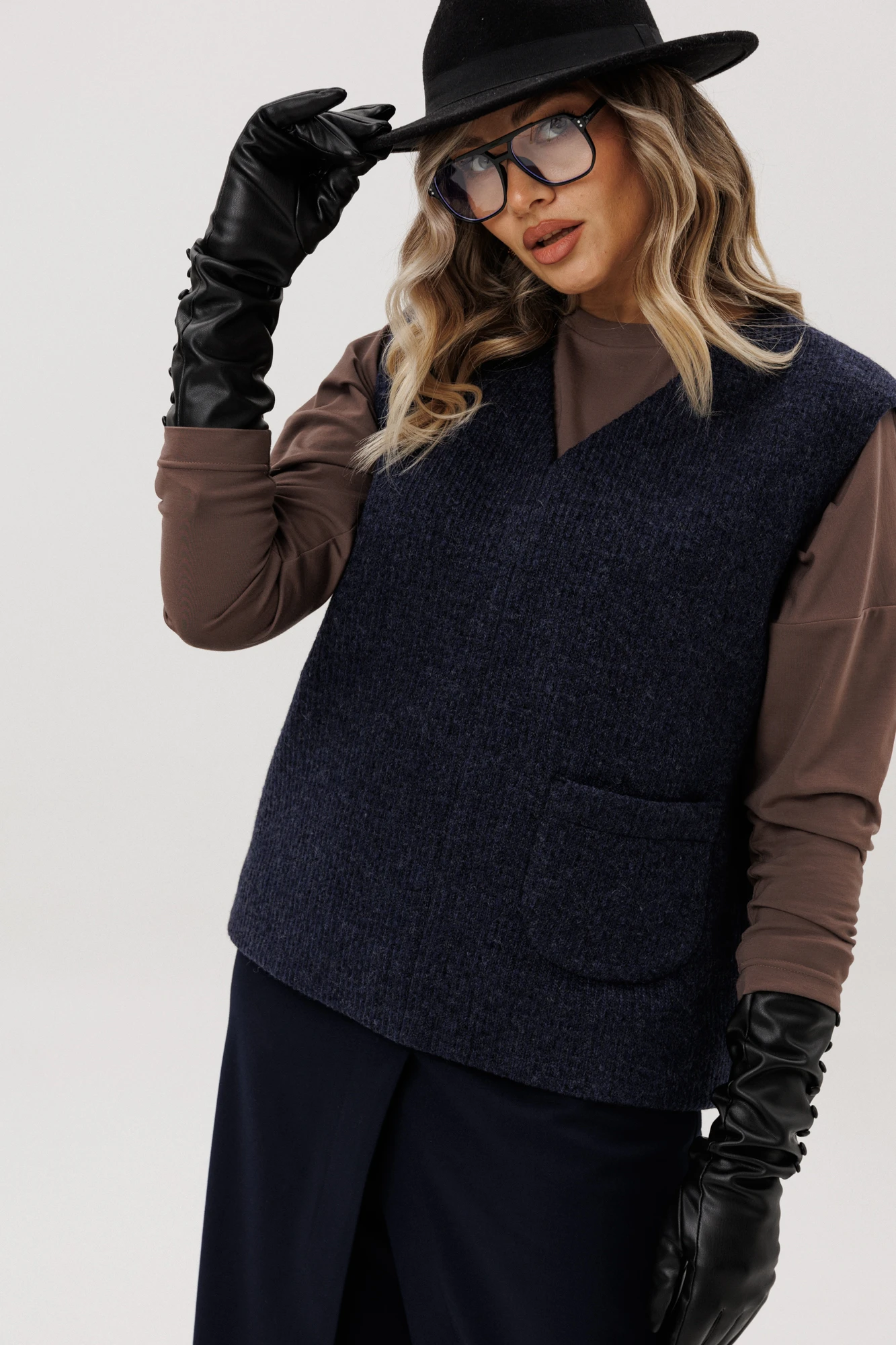 Жилет из полушерстяного вязанного полтна на трикотажной подкладке без застежки.