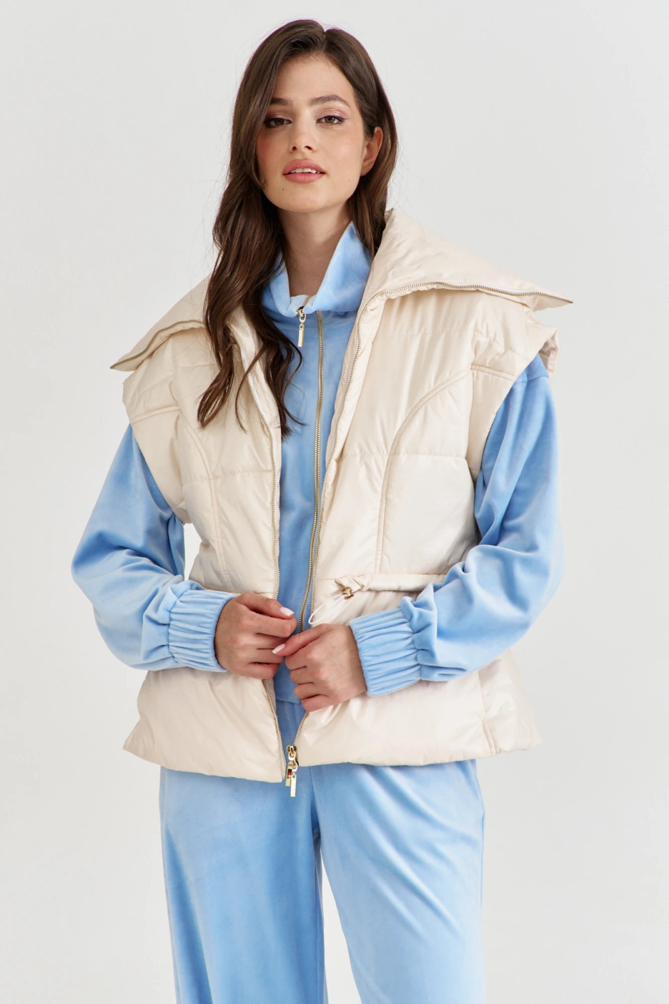 Жилетка полуприлегающего силуэта, длиной чуть выше линии бедер. Жилетка отрезная по линии талии. Лиф спинки и переда с рельефами от пройм до талии. Баска с фигурными подрезами, по переду обработаны карманы. По талии вставлена кулиса, в которую протянута резинка с фиксаторами. По горловине объемная стойка. Линия плеча спущена. по переду застёжка на декоративную тесьму-«молнию». Жилетка на подкладке и утеплена синтепоном.