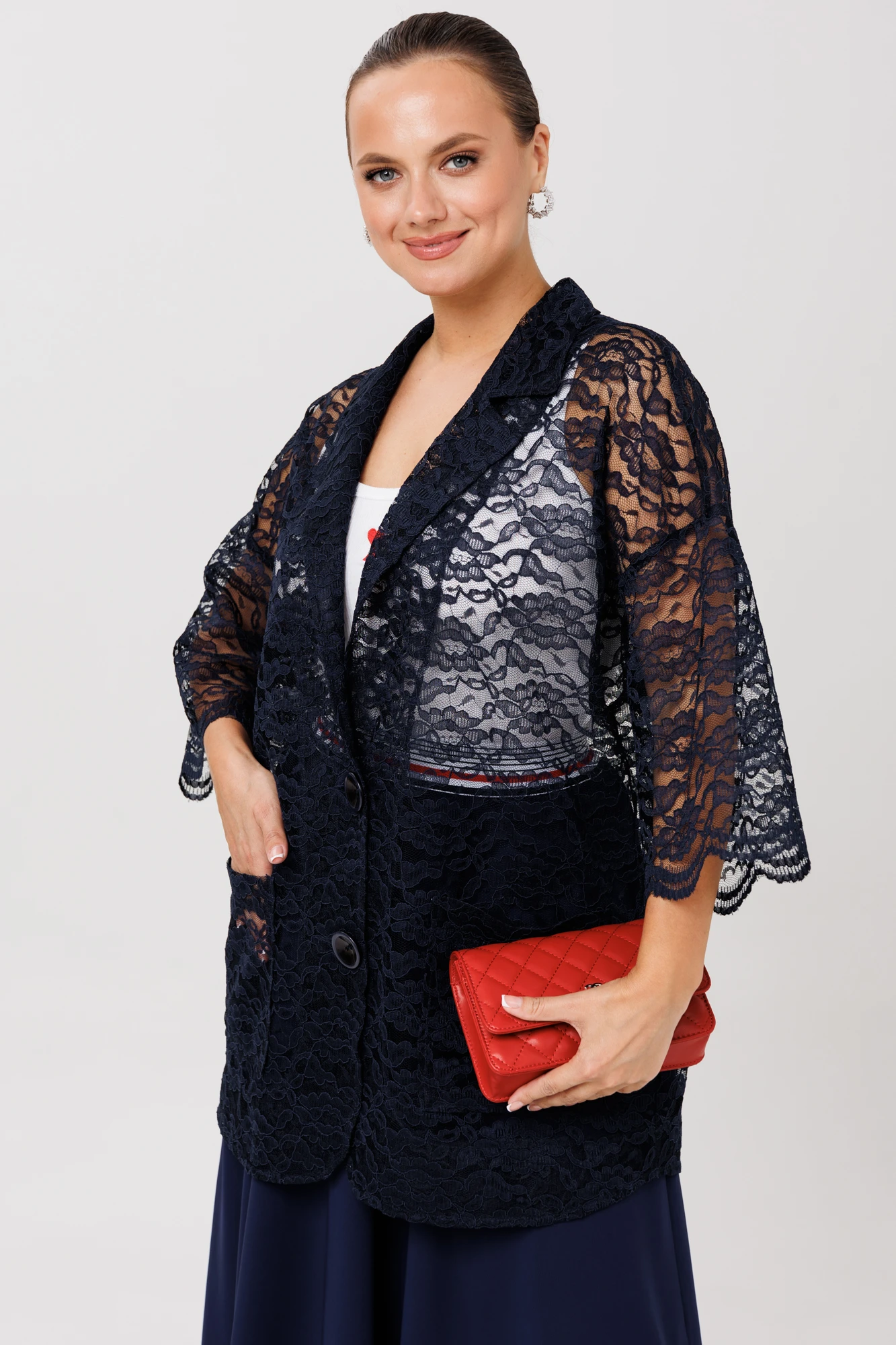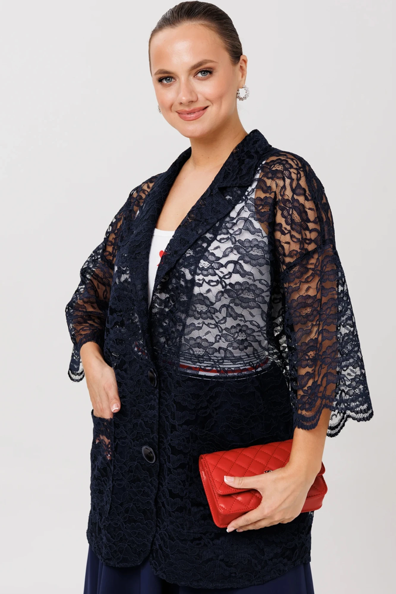 Бренд белорусской женской одежды больших размеров Anastasia представляет элегантный кружевной жакет. Жакет прямого силуэта со спущенным плечом. Рукав 3/4 длины. Застежка на пели и пуговицы, воротник пиджачного типа. По полочке идут накладные карманы, низ фигурный. Стильный жакет оверсайз невероятно удобный и практичный. Отличный вариант в офис, в школу, на работу, на каждый день. Жакет выгодно подчеркнет достоинства фигуры и скроет недостатки, подходит для девушек любых размеров одежды. Комфортный удобный, хорошая посадка и современный дизайн. Длина по спинке: (52-60) - 77 см, (62-68) - 79 см. Длина рукава: (52-68) - 30 см