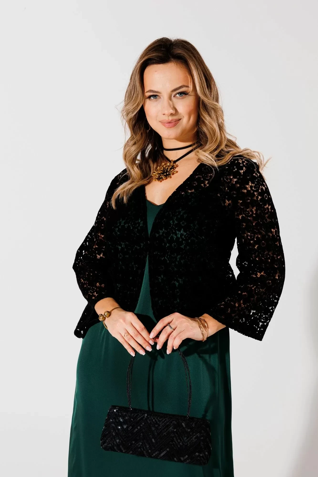 Жакет на бархатной основе которого расположены утонченные узоры кружева, создавая игривый и женственный акцент. Это болеро идеально дополнит любое платье, превращая повседневный наряд в утонченный вечерний образ.