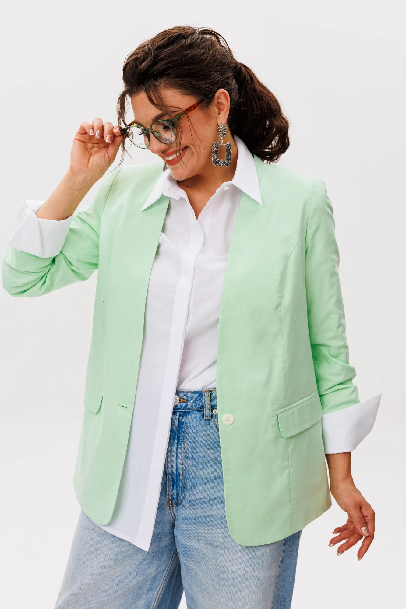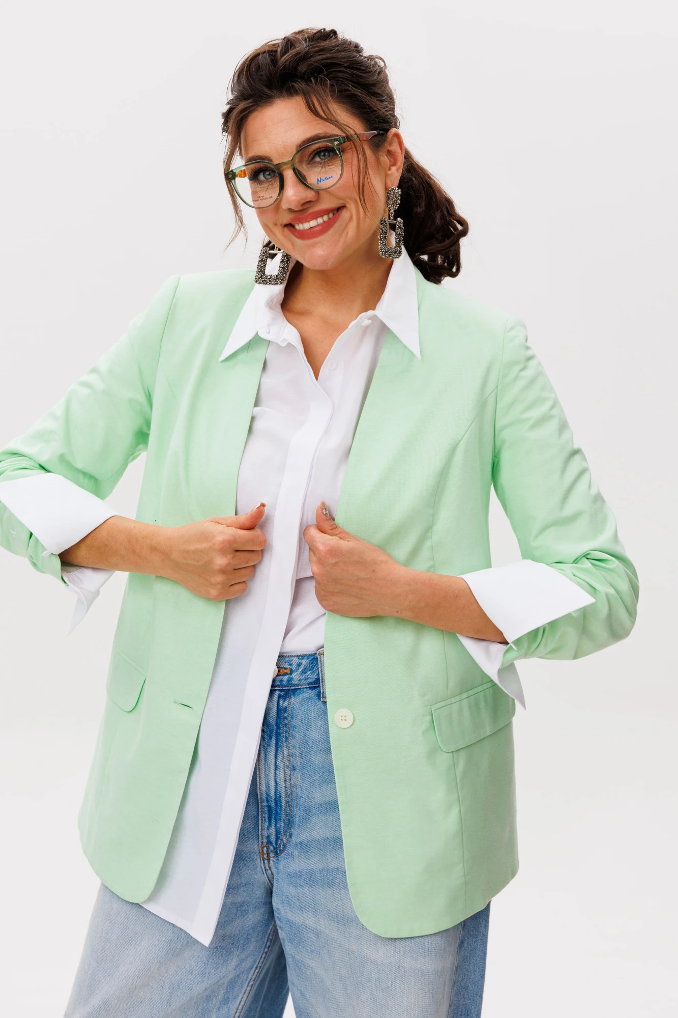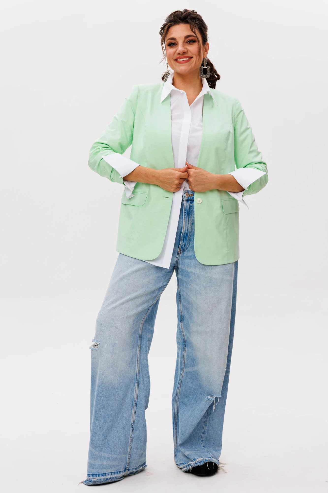 Этот жакет — универсальная основа для множества образов. Он прекрасно дополнит летнее платье, классические брюки или воздушную юбку, а в сочетании с голубыми джинсами и кедами создаст свежий и непринужденный повседневный лук. Нежный мятный цвет придает легкость и свежесть, делая его идеальным выбором для летних прогулок, встреч в городе или отдыха.