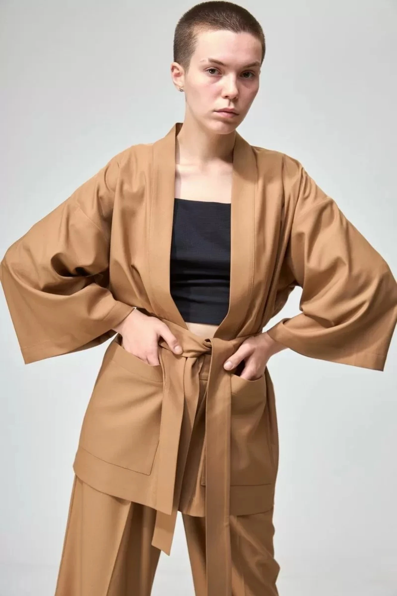 "Свободный мягкий жакет-кимоно без подкладки с большими карманами самого актуального цвета осени отлично впишется в ваш деловой и повседневный гардероб. Идеально подойдет к любым брюкам, юбкам и джинсам.