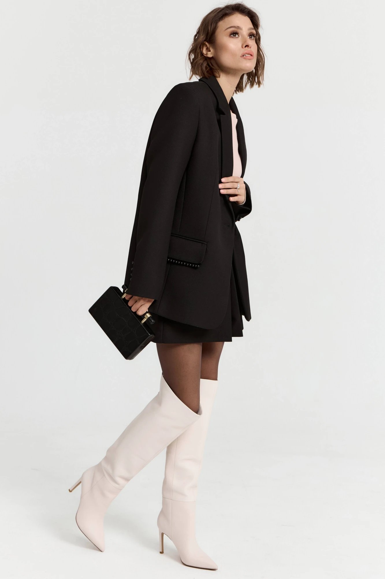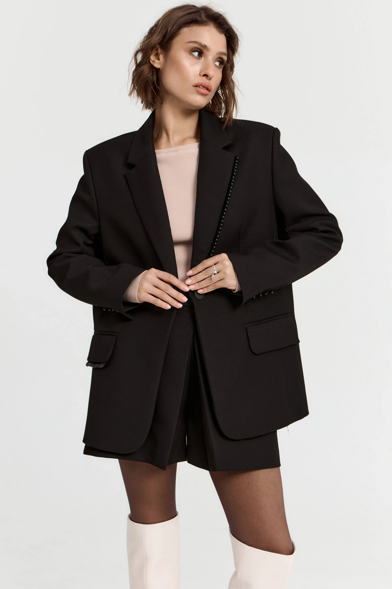 Жакет прямого кроя, однобортный, полностью на подкладке, выполнен из костюмной ткани. По переду изделия функциональные карманы с декорированным клапаном. По спинке разрезы в боковых швах. Застежка на пуговицы.