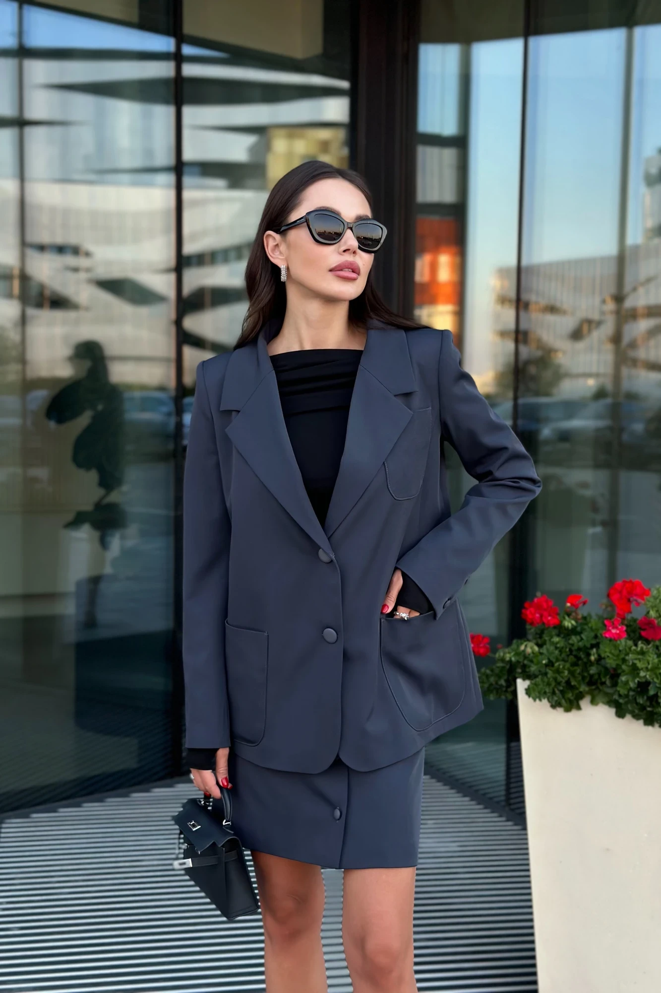 Жакет на подкладке, застёгивается на 1 пуговицу. Рукава втачные. Воротник отложной, костюмный. Обработан накладными карманами. По центру спинки обработана шлица. Рукава также обработаны шлицей, застёгивающимися на пуговицы.