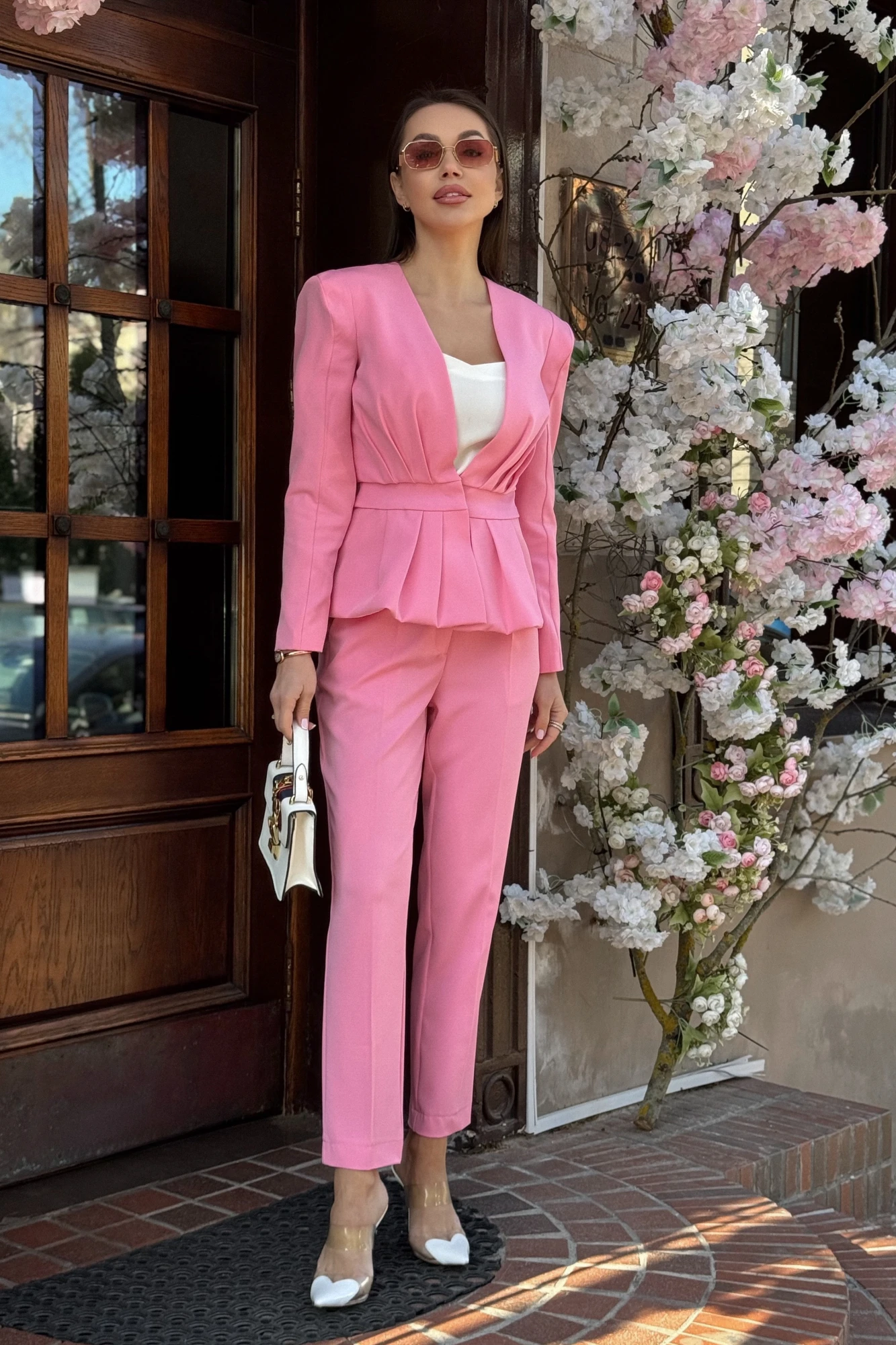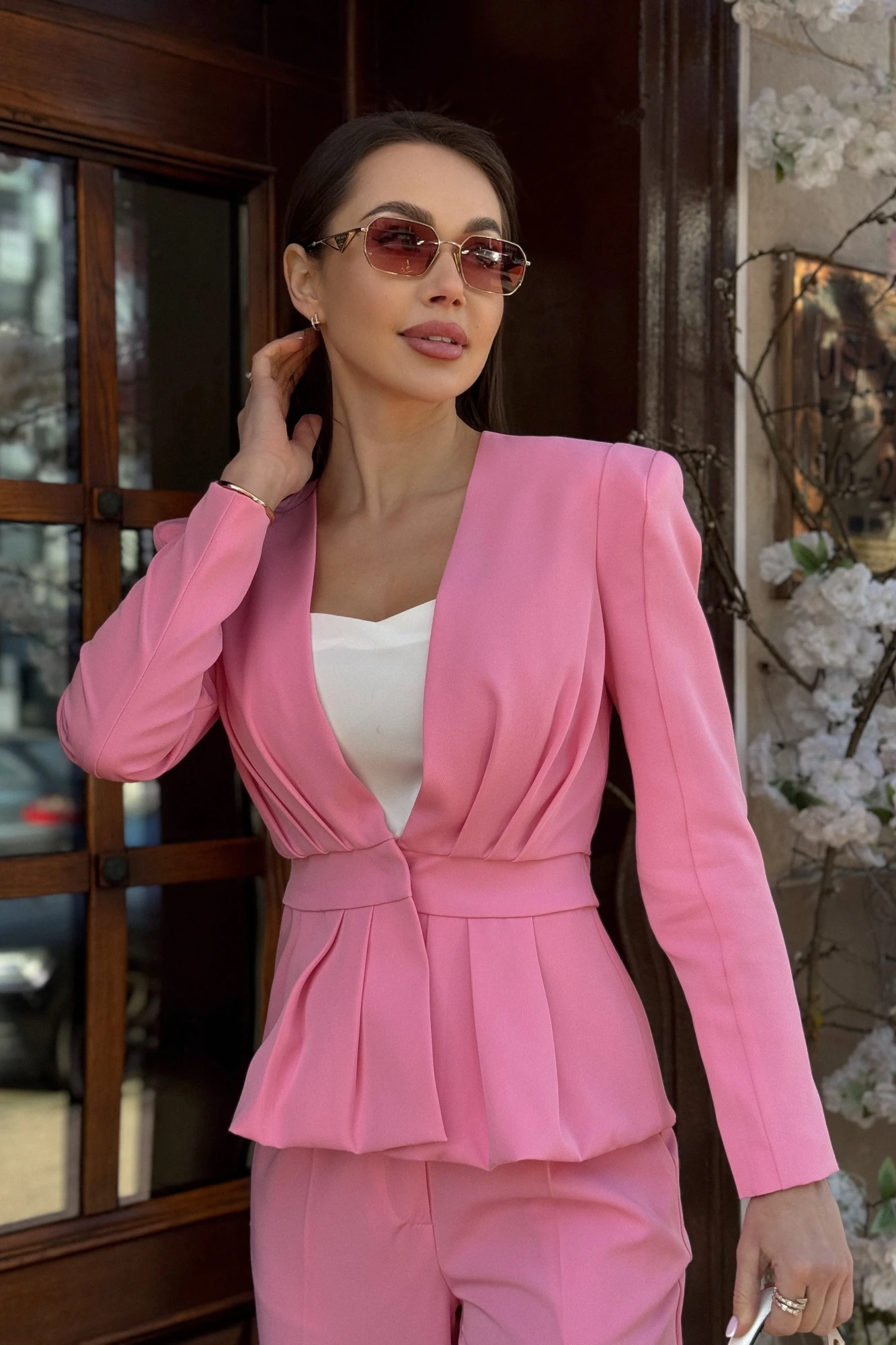 Жакет приталенного силуэта, обработан подкладкой. Отрезной по линии талии, декорирован пришитым поясом по линии талии. Низ изделия обработан баской, собранной в складку. Рукав длинный, вачной. Окат рукава обработан вставкой для удлиннения плечевого шва. Перед жакета обработан сборкой.