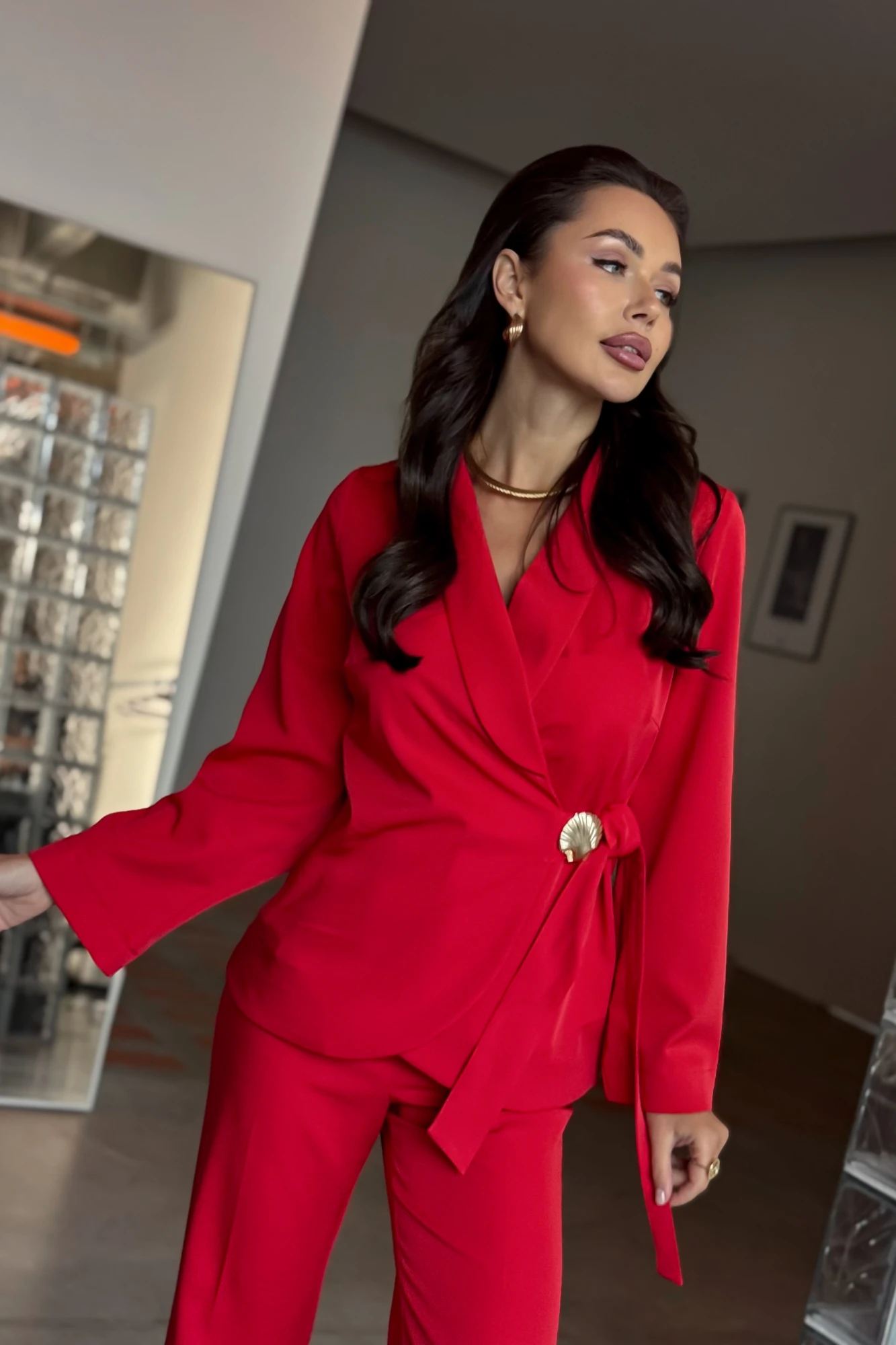 Жакет без подкладки, швы обработаны кантом в цвет изделия. Рукав втачной, прямой, одношовный. Воротник шаль. Застежка на притачной пояс, дополнен съёмной пряжкой золотистого цвета.