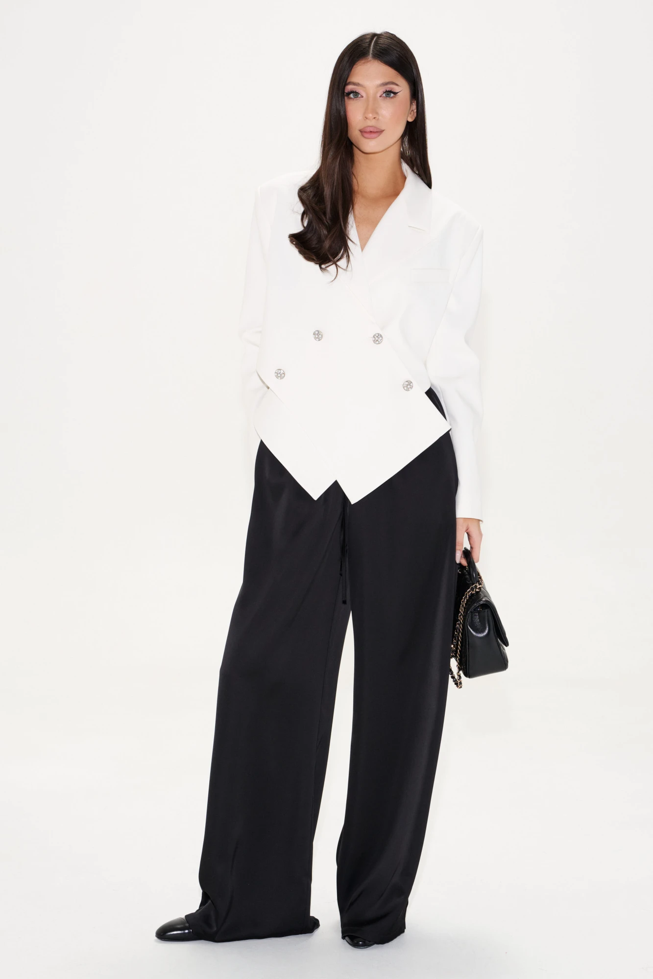 Жакет прямого свободного кроя выполнен из тексильного полотна белого цвета. Характеристики: укороченная длина, рукав втачной прямой, подкладка, подплечники, по переду изделия двубортная фигурная застежка, декоративные пуговицы. Длина по спинке 42 см, длина рукава 62 см