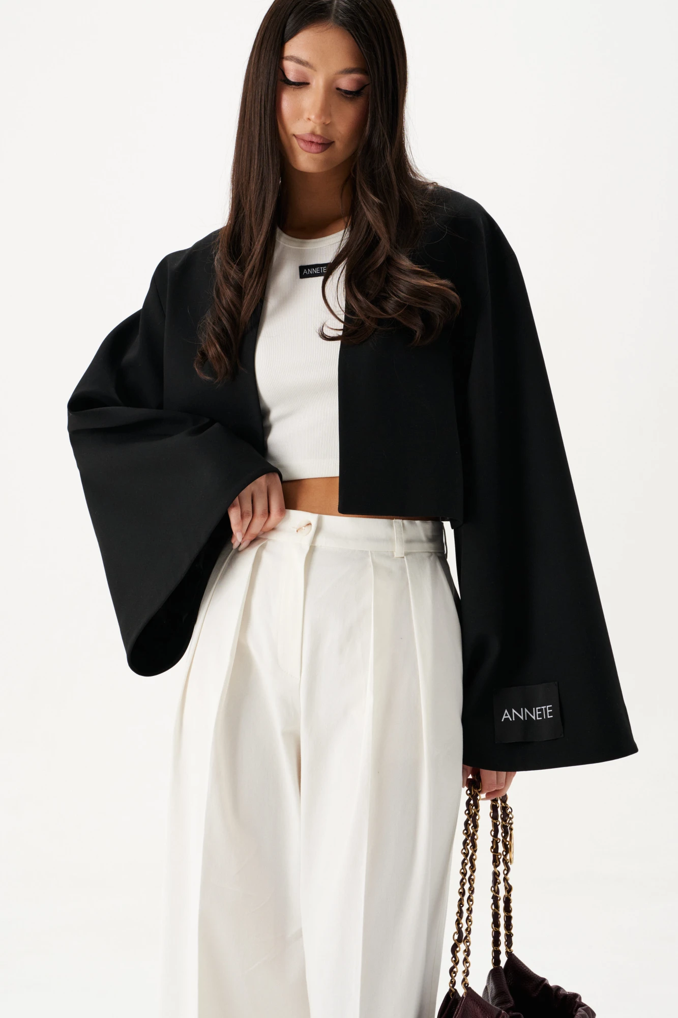 Жакет прямого свободного кроя. Воротник стойка переходяший в V-образный вырез, подкладка. Широкие спущеные рукава, на левом рукаве нашивка Annete. Без застёжки. Длина по спинке 42 см, длина рукава от горловины 78 см.