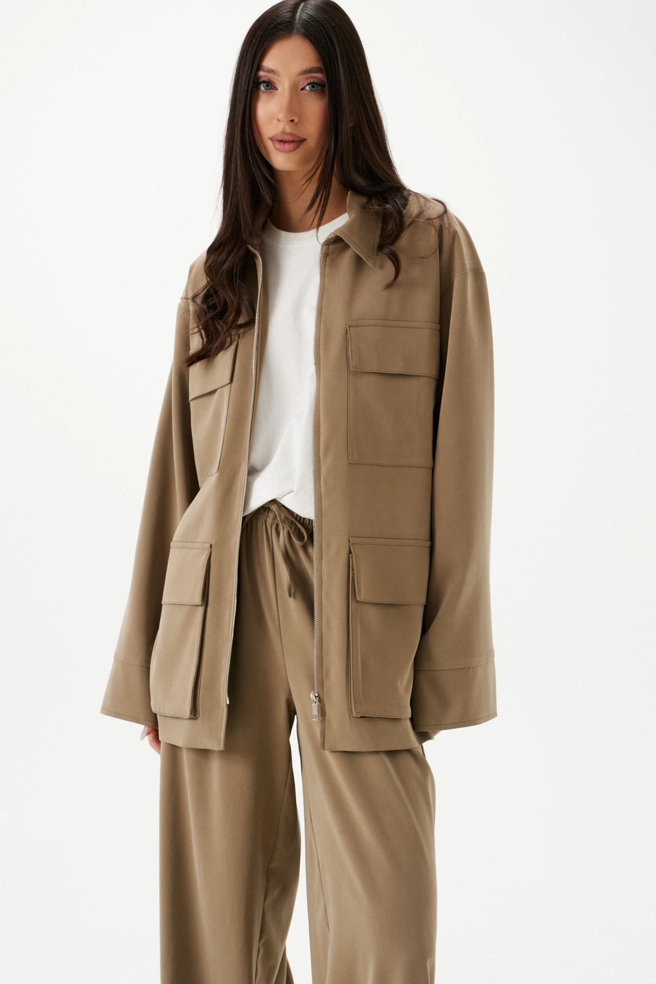 Жакет прямого кроя. Выполнен из трикотажного полотна. Есть подкладка. Воротник рубашечного типа. Рукав втачной, спущенный, с манжетой. Застёжка центральная потайная молния. По переду накладные карманы с клапаном. Шлёвки, пояс из ткани основного изделия. Длина рукава от линии втачивания 60 см. Длина спинки 72 см